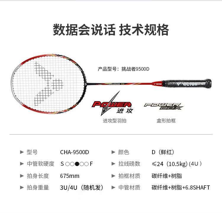 威克多(VICTOR)羽毛球拍胜利单拍全碳素进攻型经典CHA-9500C/D红色4U穿线