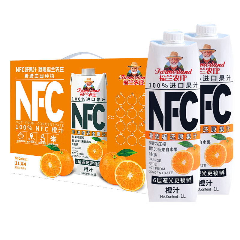 福兰农庄 NFC橙汁1L*4瓶(礼盒装) 纯鲜榨果汁 饮料 儿童饮料 欧洲进口 整箱装