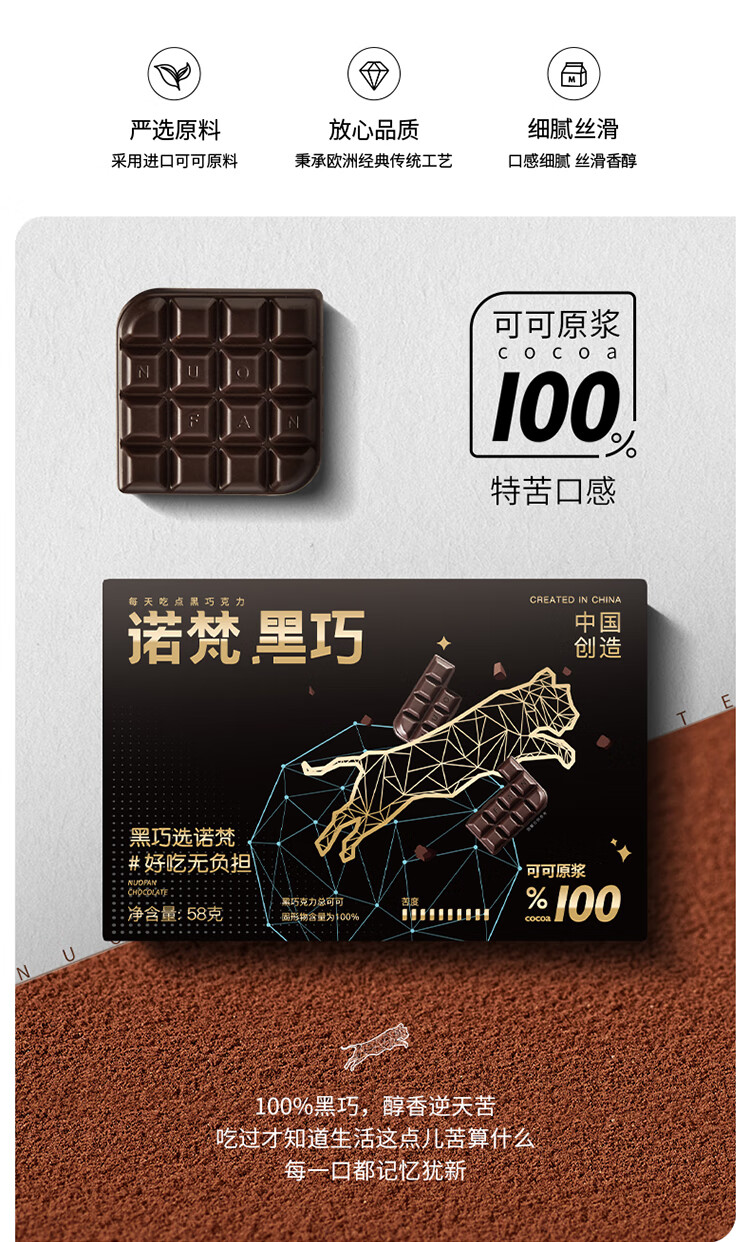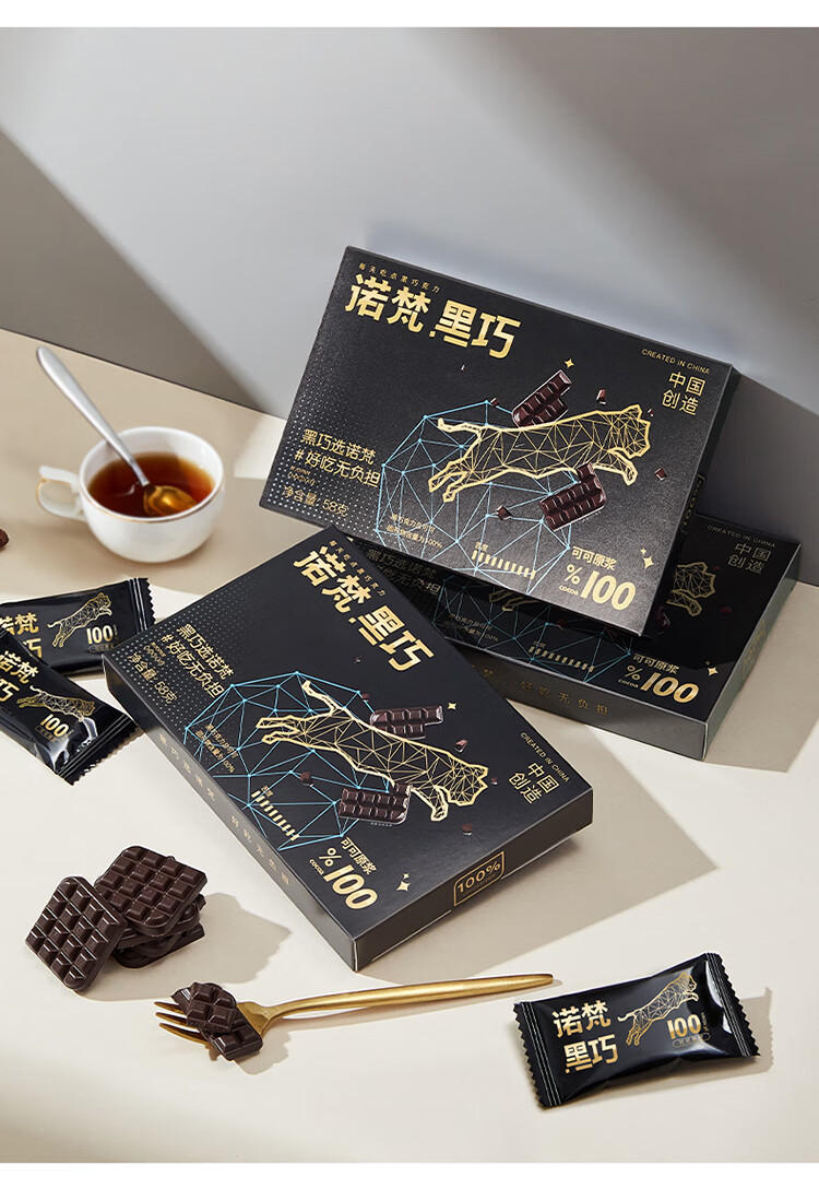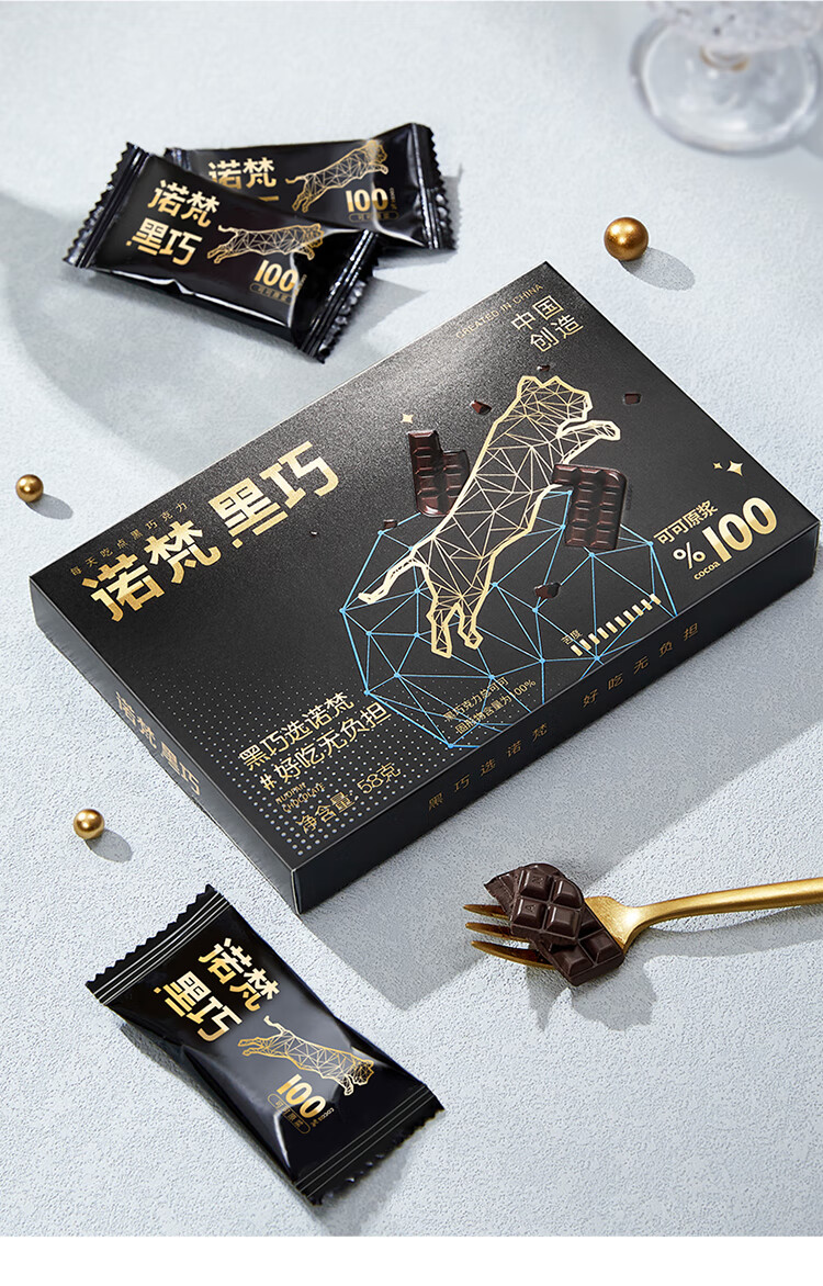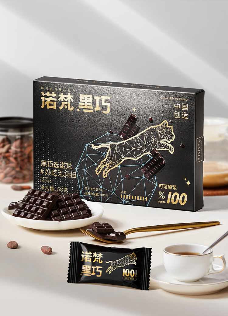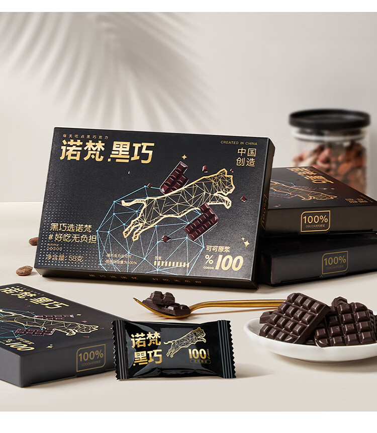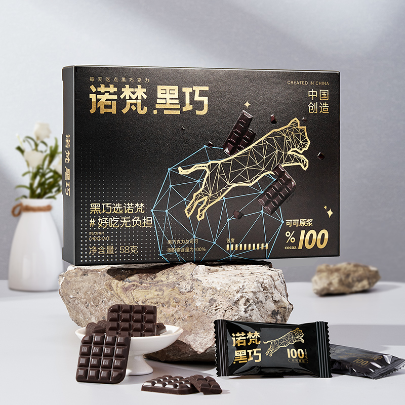诺梵纯黑可可脂黑巧克力100%特苦无添加蔗糖健身零食搞怪伴手礼58g