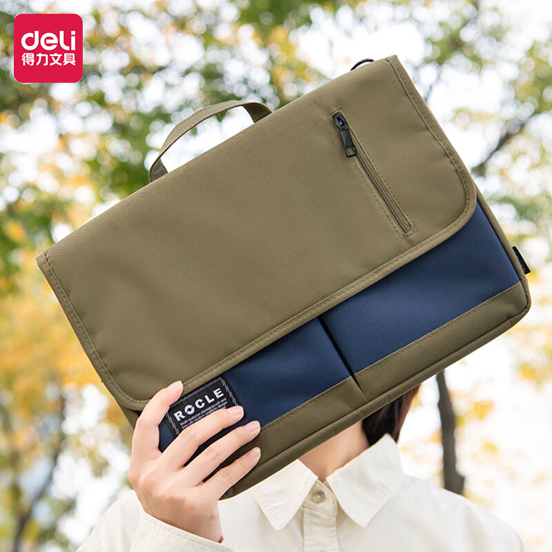 得力(deli)源源得力公文包 斜挎背包/文件袋事务包/手提包/学生包袋/资料袋电脑包魔术贴前置口袋 绿色63811