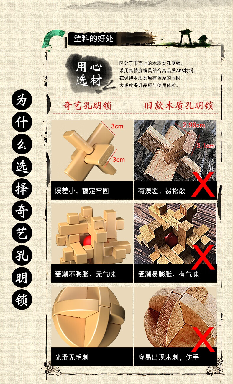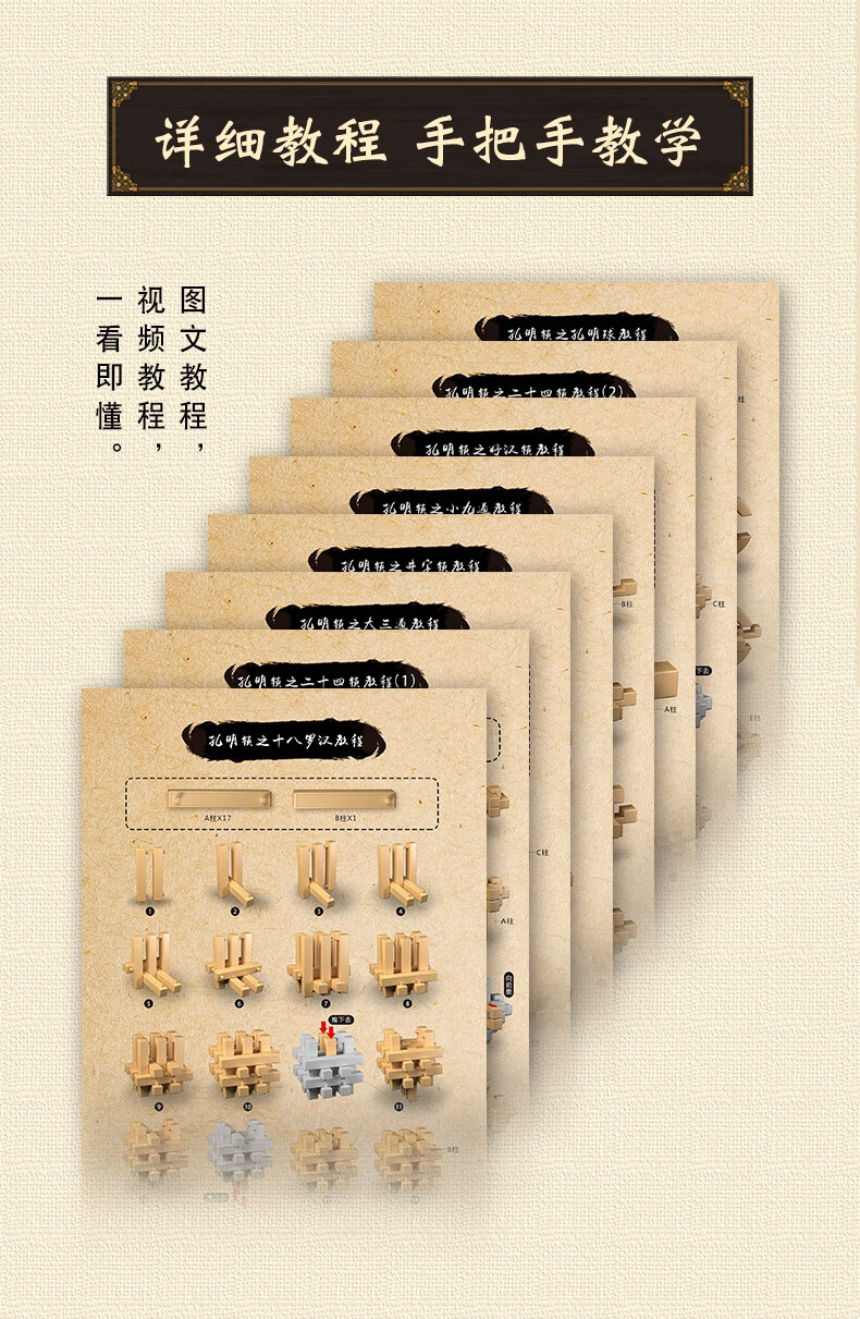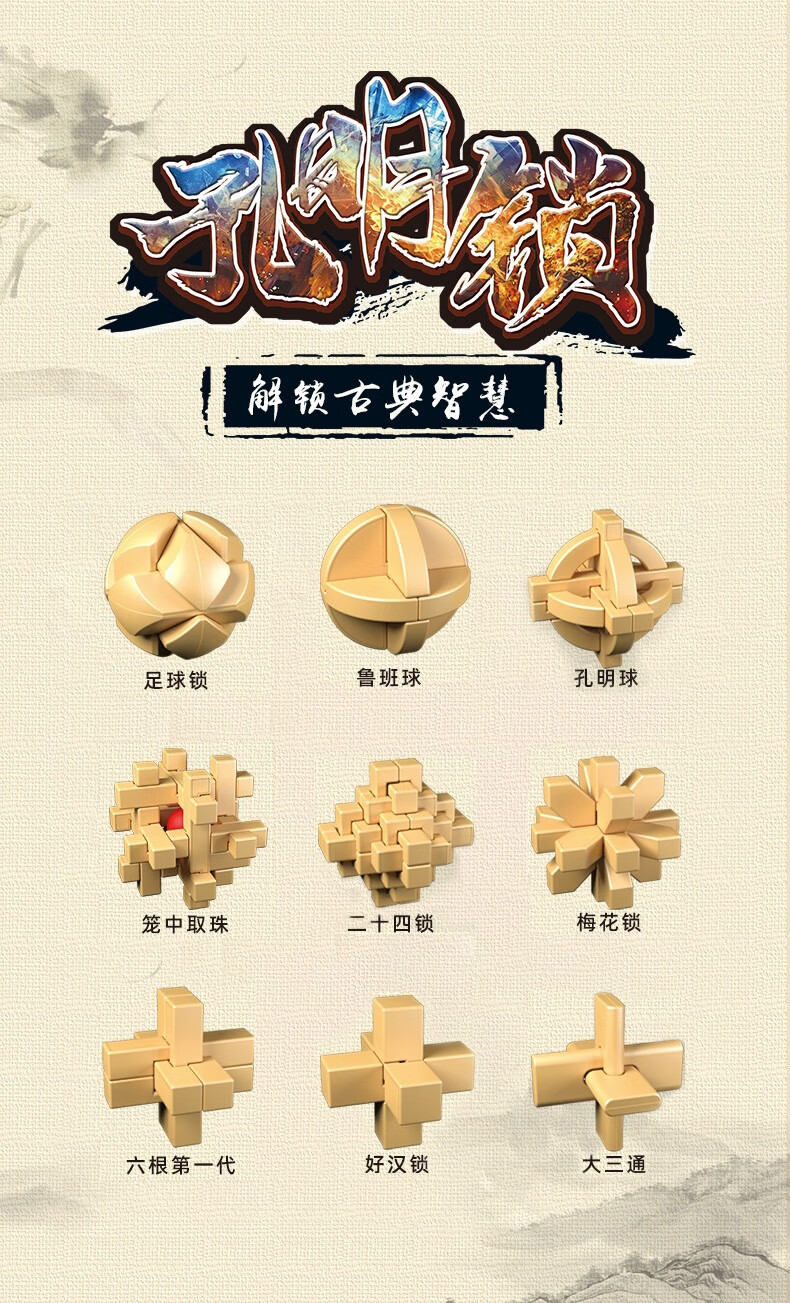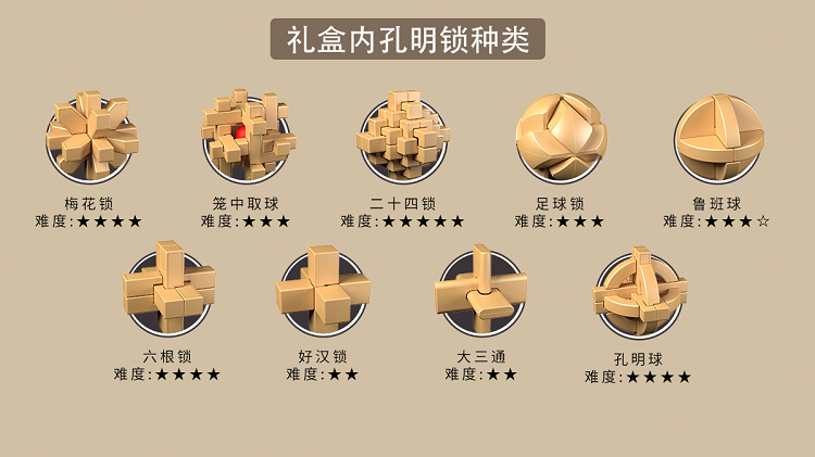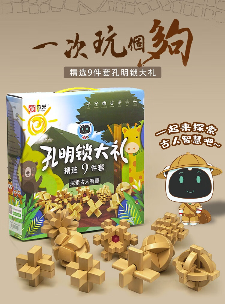 奇艺孔明锁9件套装礼盒 鲁班锁六根锁大三通好汉锁榫卯足球锁积木组合智力玩具大礼包男孩小孩儿童生日礼物