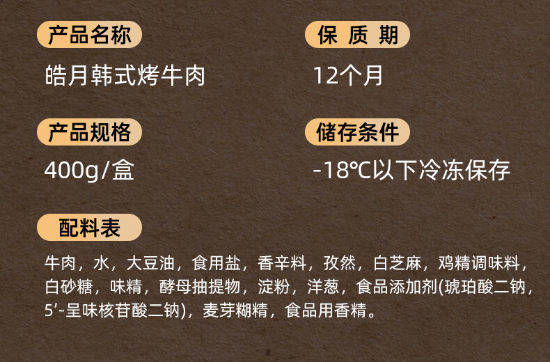 皓月韩式烤牛肉400g韩式烧烤 半成品食材 家庭腌制烤肉 冷冻生鲜