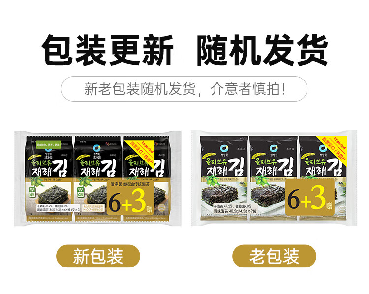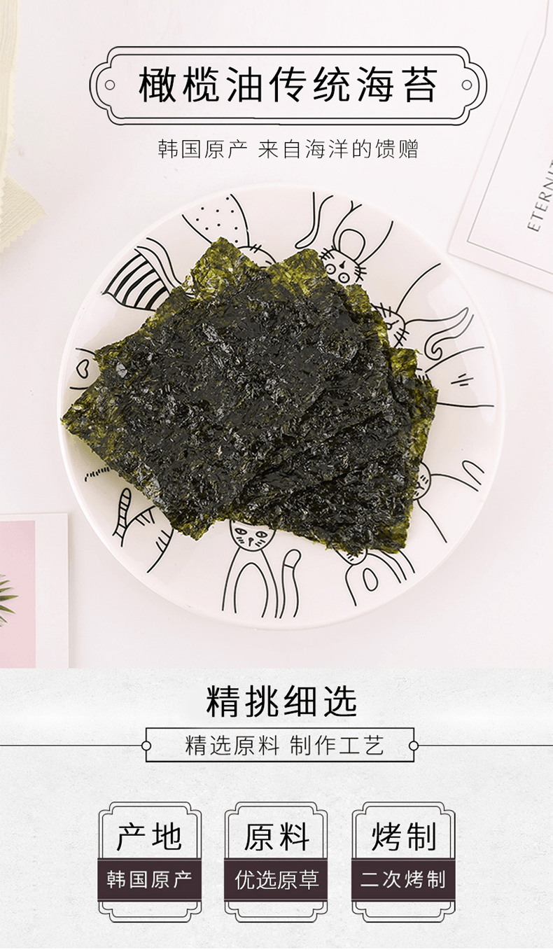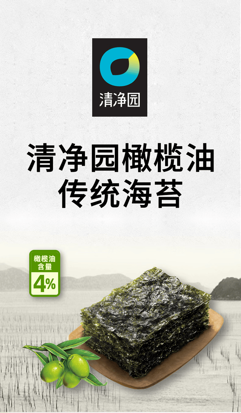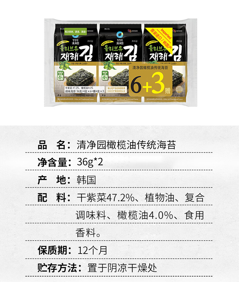 清净园 韩国进口 橄榄油传统海苔 儿童零食紫菜片 海苔脆 拌饭40.5g*2袋