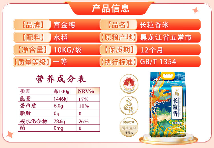 宫金穗 五常长粒香 东北大米 当季新米10kg 软香米 硬米20斤