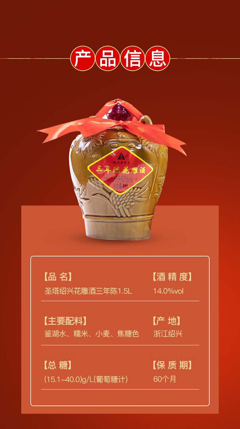 圣塔 绍兴花雕酒 五年1.5L 半干型 绍兴黄酒 加饭酒