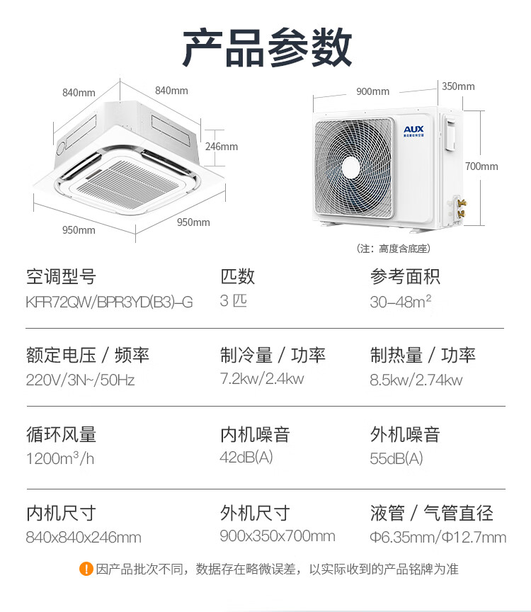 奥克斯(AUX)中央空调天花机3匹变频冷暖吸顶空调嵌入式吊顶空调商用天井机220V KFR72QW/BPR3YD(B3)-G京仓派送