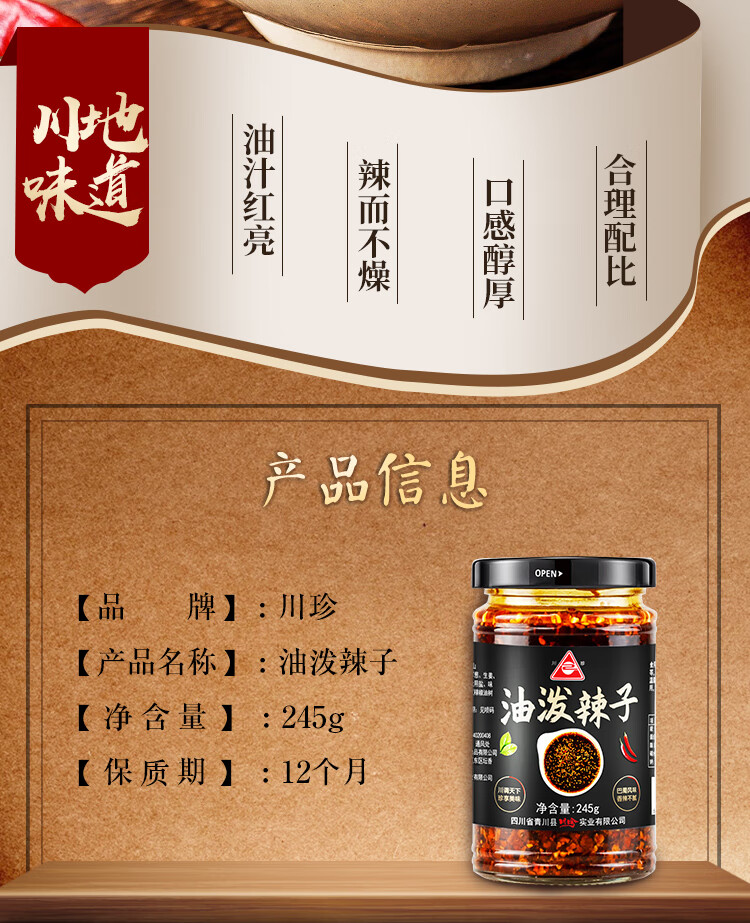 川珍 油泼辣子245g红油辣椒酱香辣凉拌菜四川海椒油调味料
