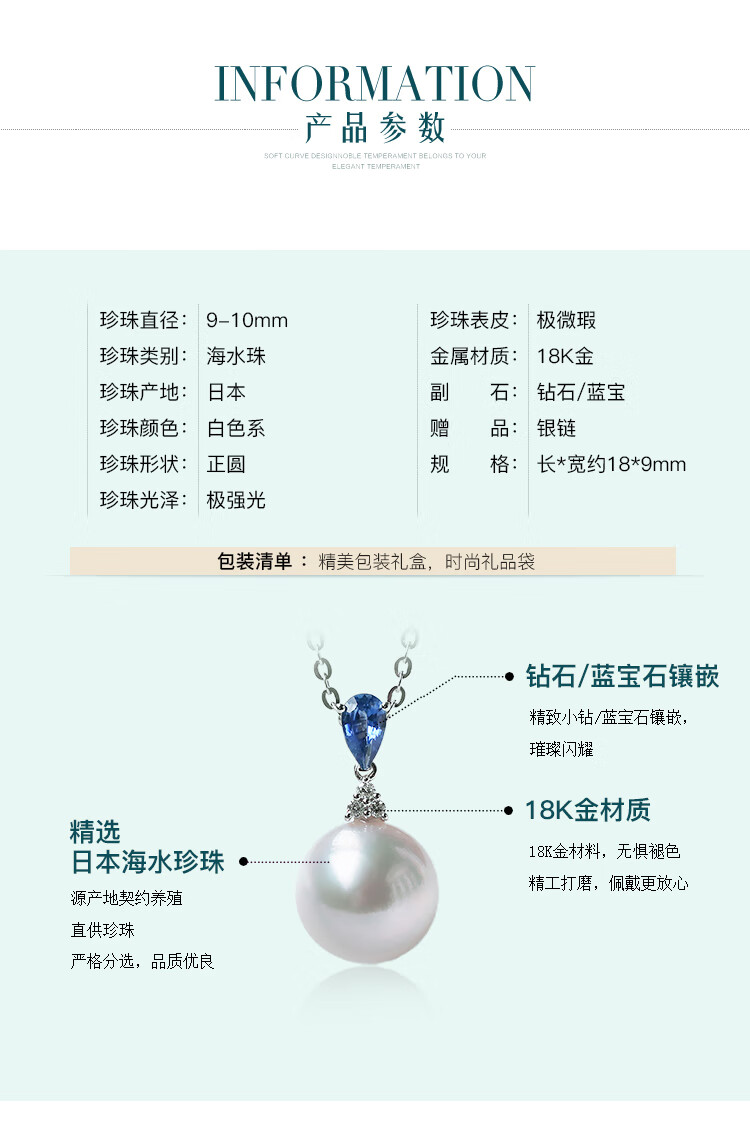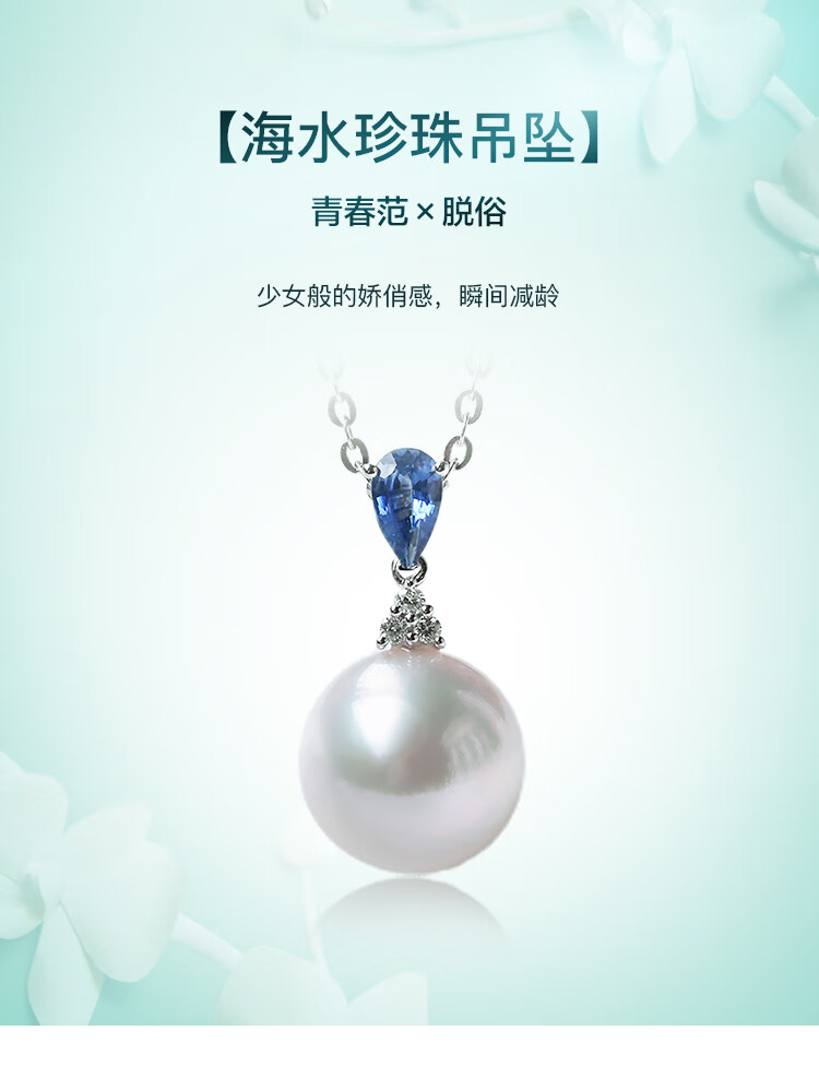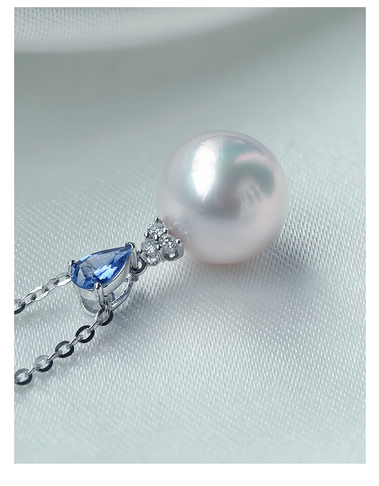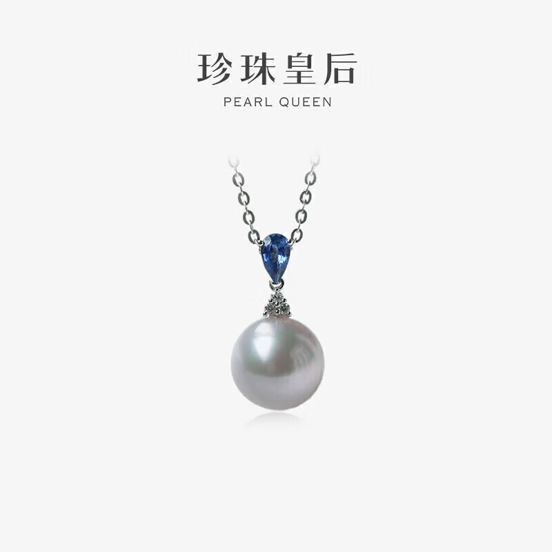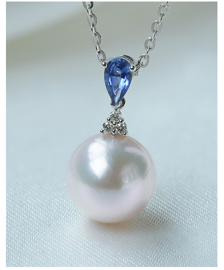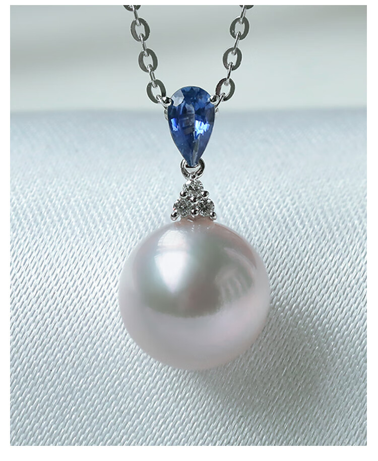 珍珠皇后 18K金镶钻石蓝宝海水珍珠吊坠单颗 9-10mmAkoya海水珍珠项链女