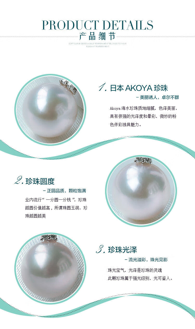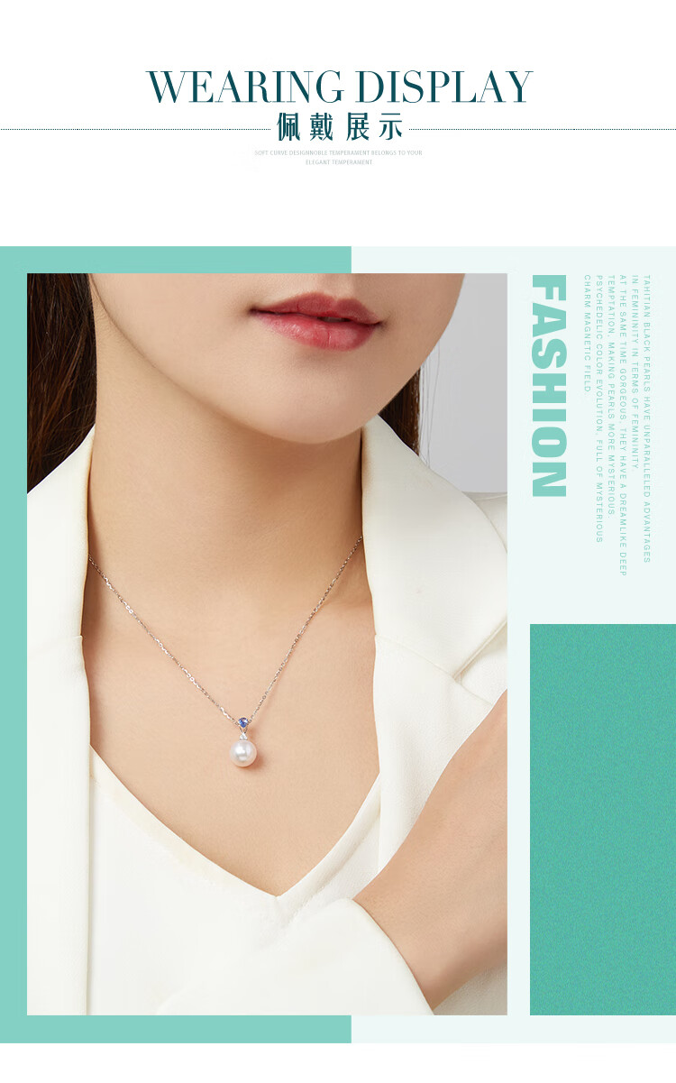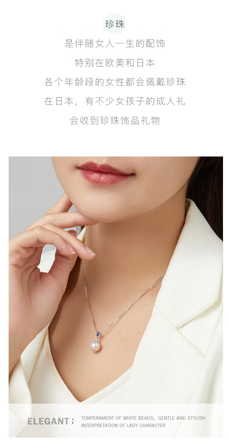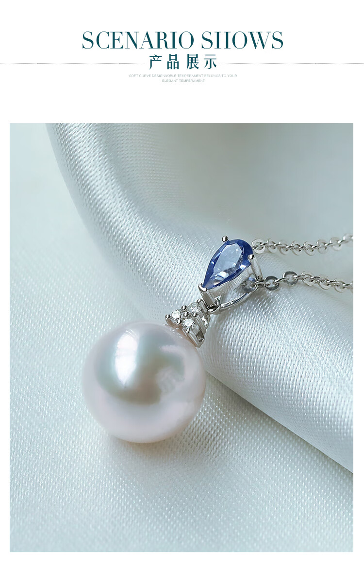 珍珠皇后 18K金镶钻石蓝宝海水珍珠吊坠单颗 9-10mmAkoya海水珍珠项链女