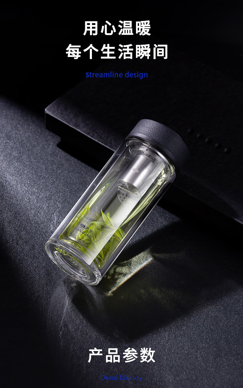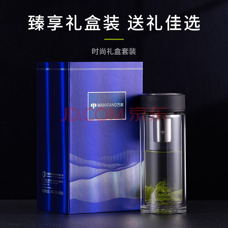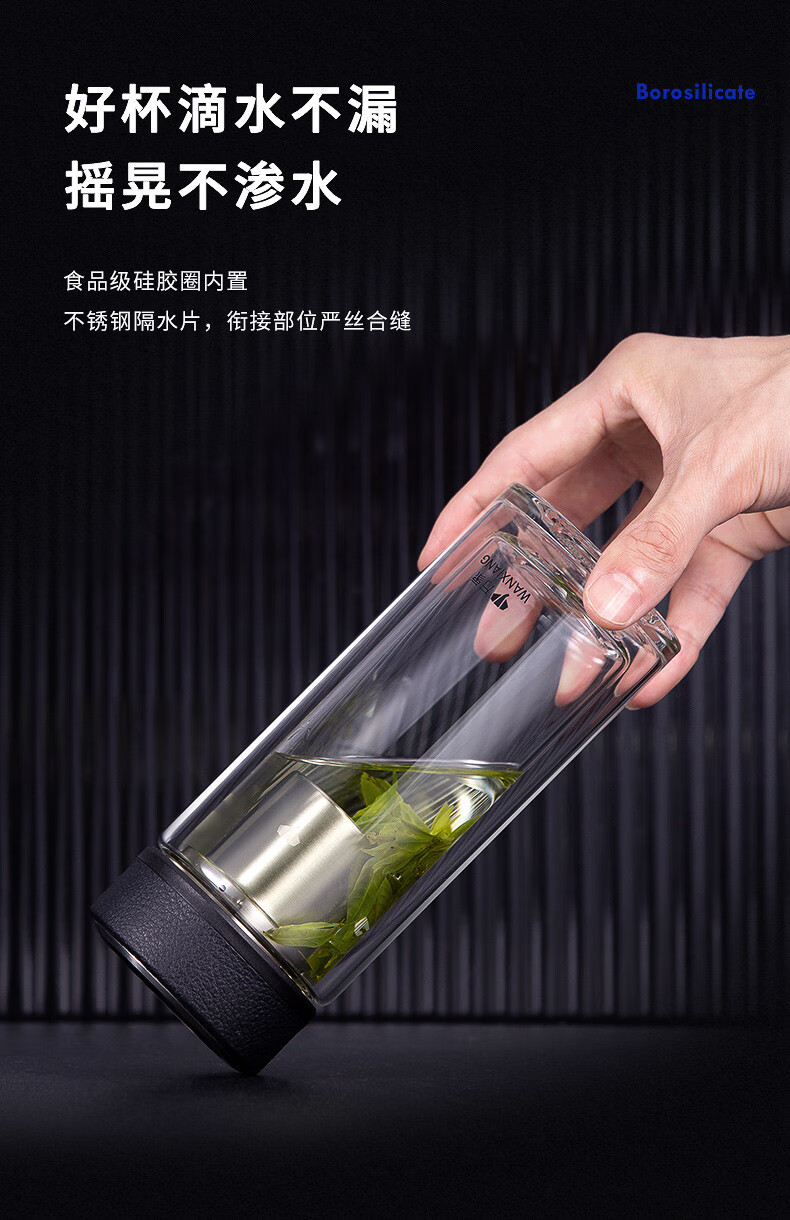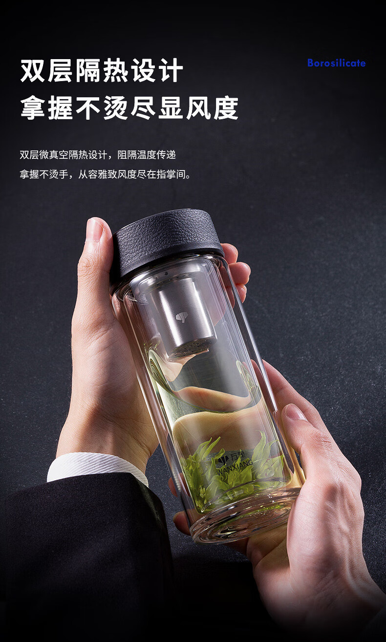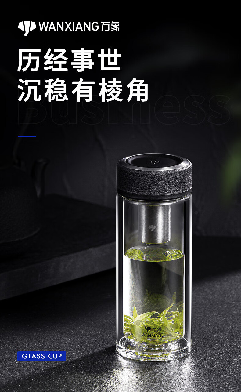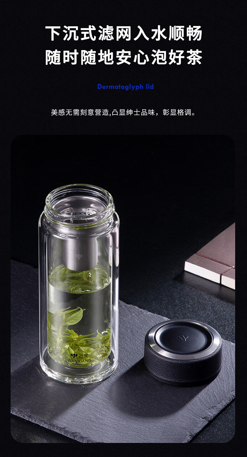 万象(WANXIANG) 玻璃杯商务便携直身办公室双层玻璃杯居家车载耐热带滤网茶杯 V19SL-皮纹黑