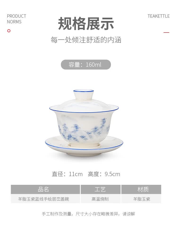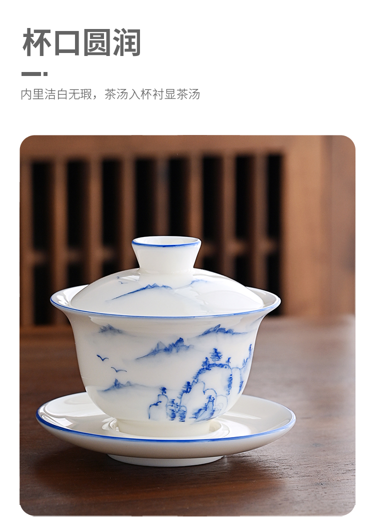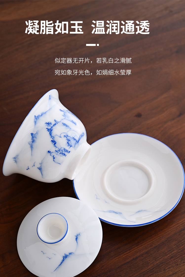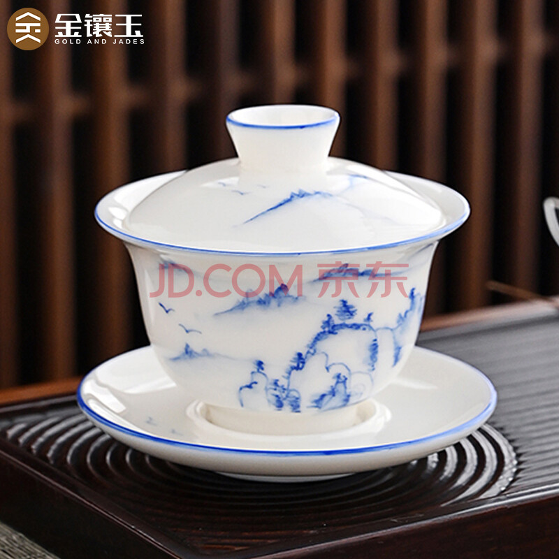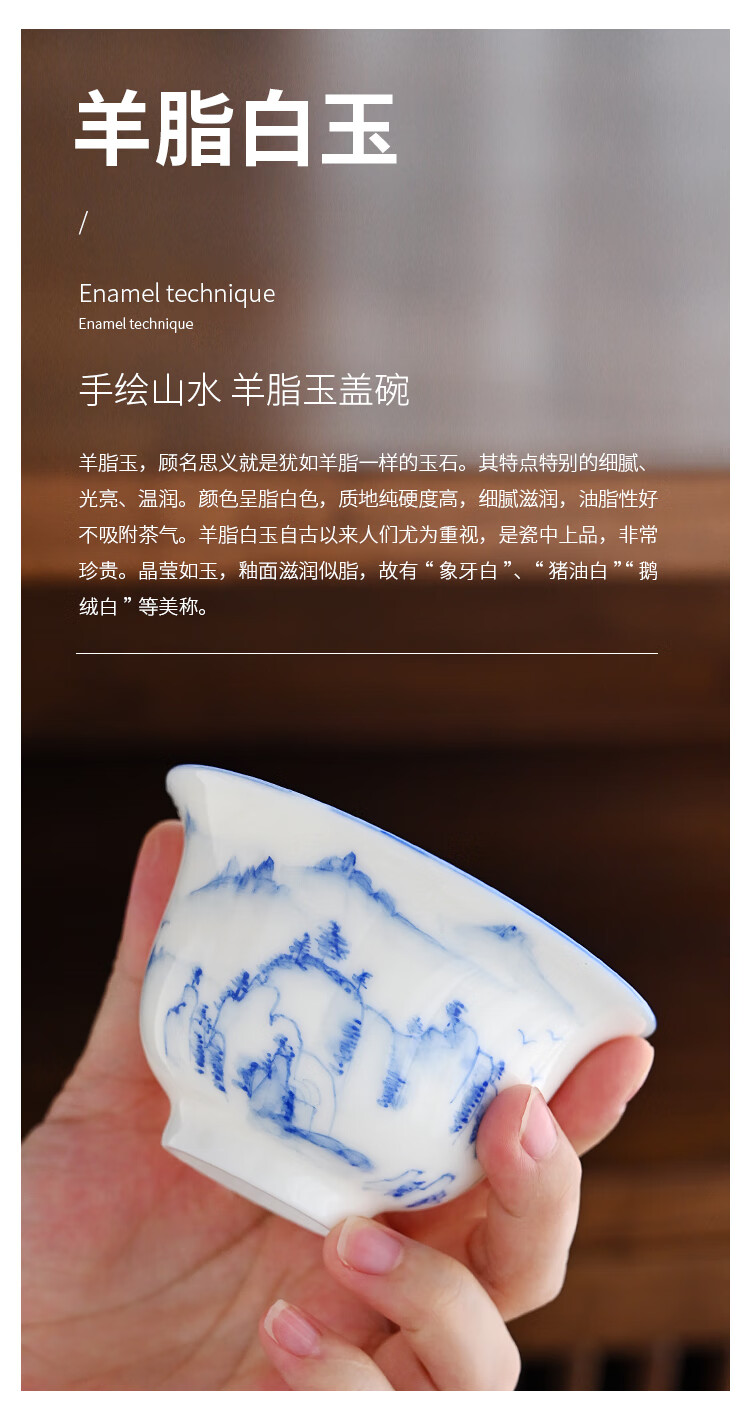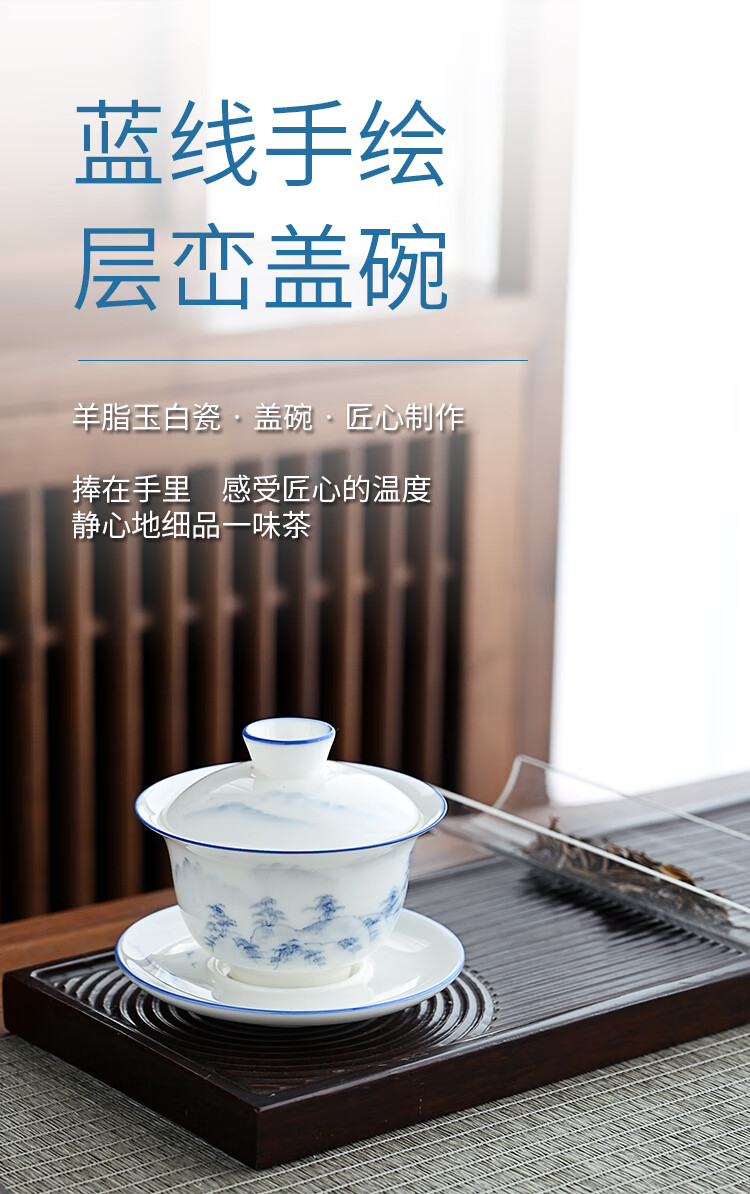 金镶玉 盖碗茶具 功夫茶手绘三才泡茶碗 羊脂玉瓷蓝线手绘层峦盖碗
