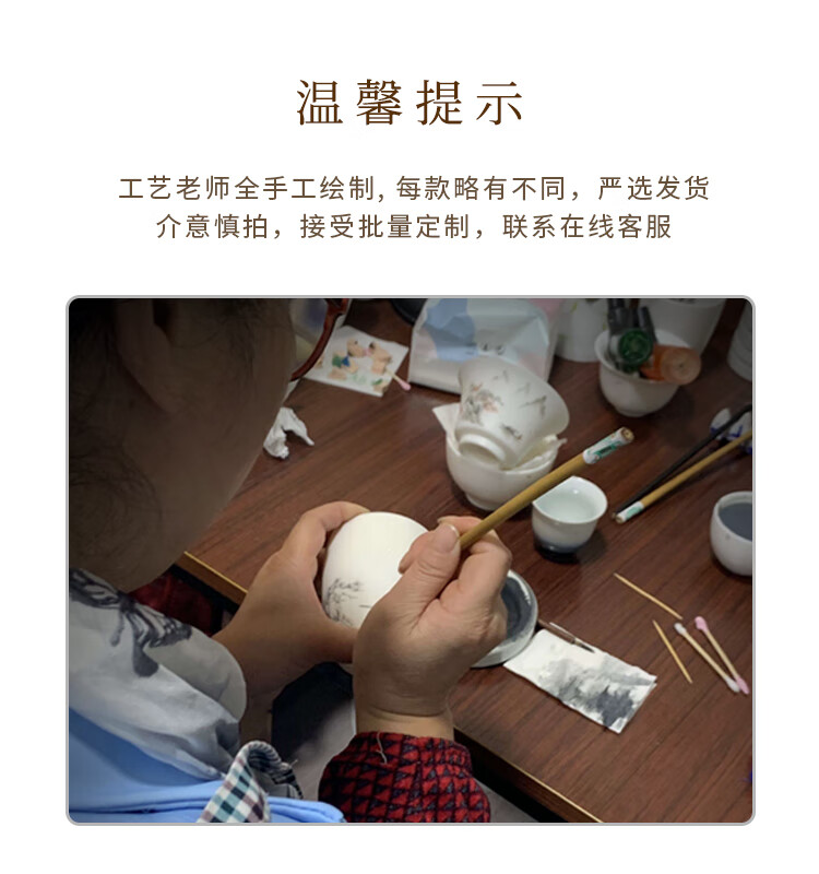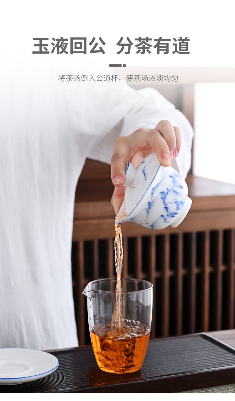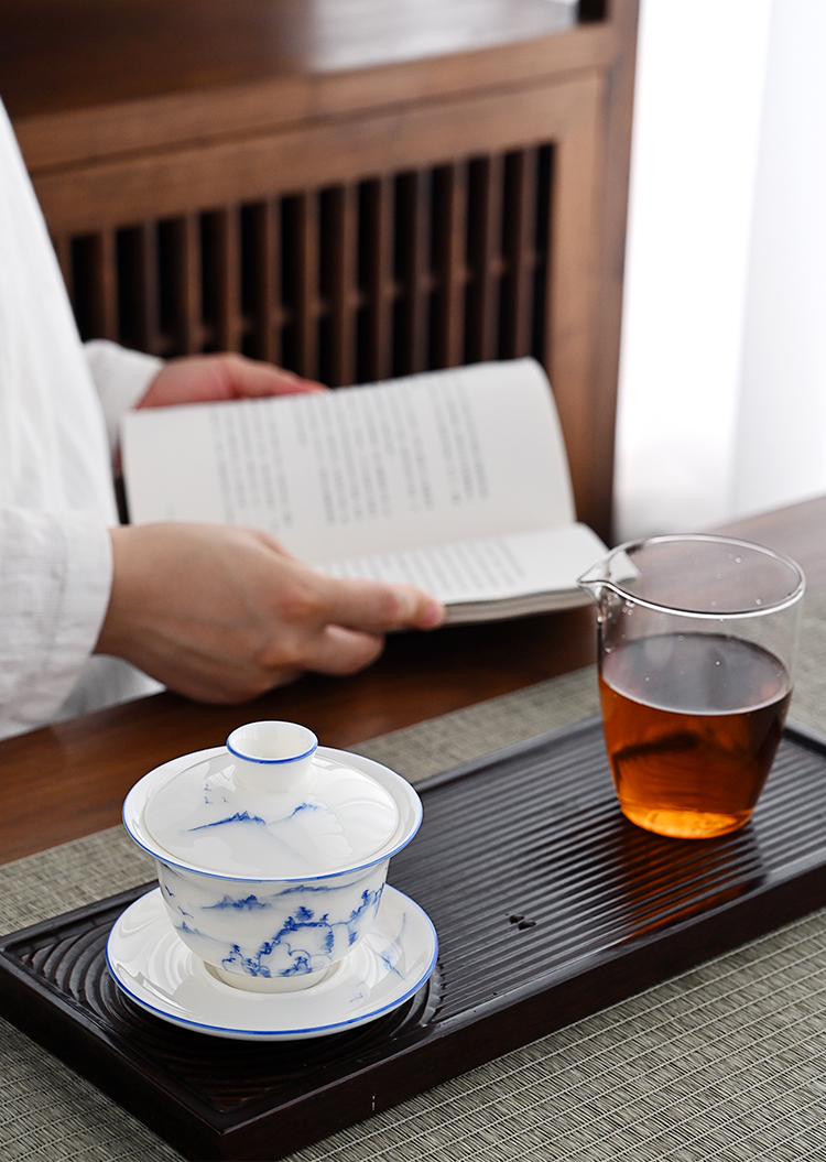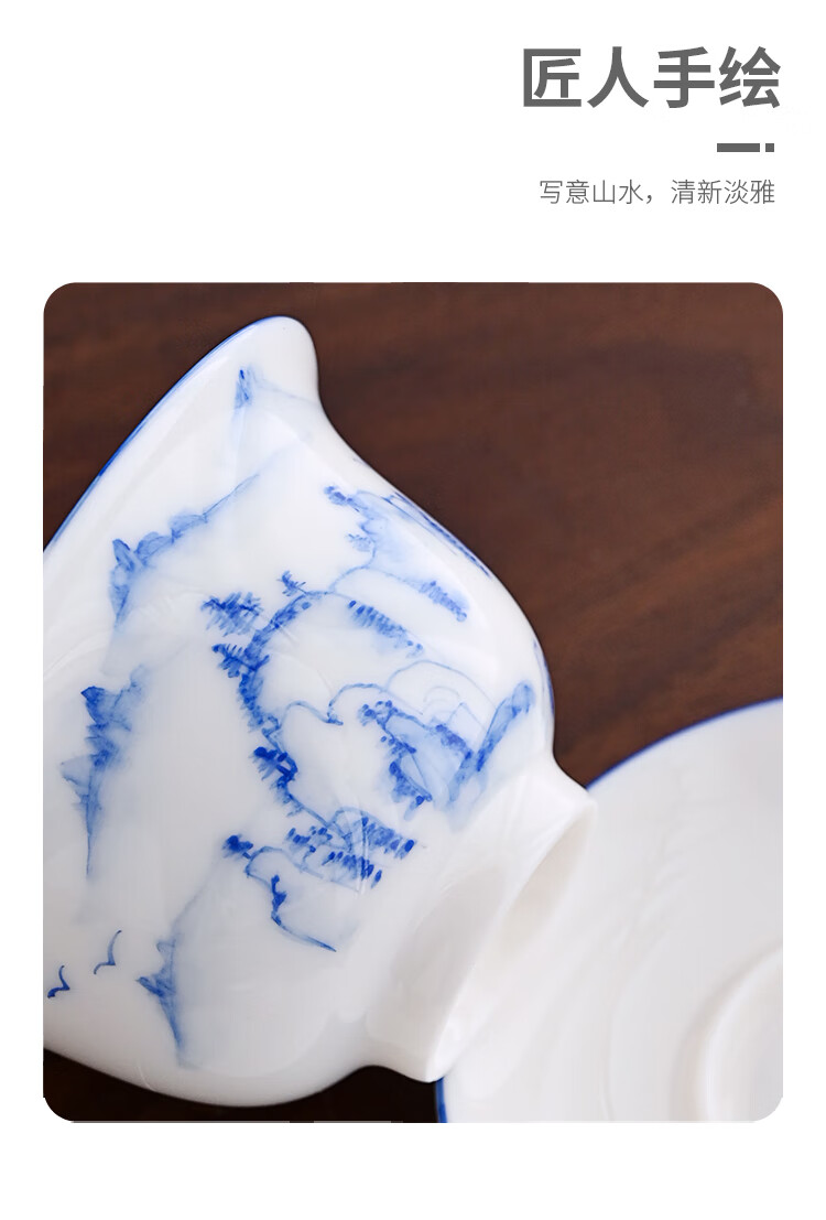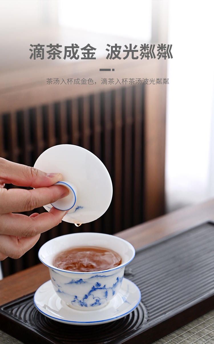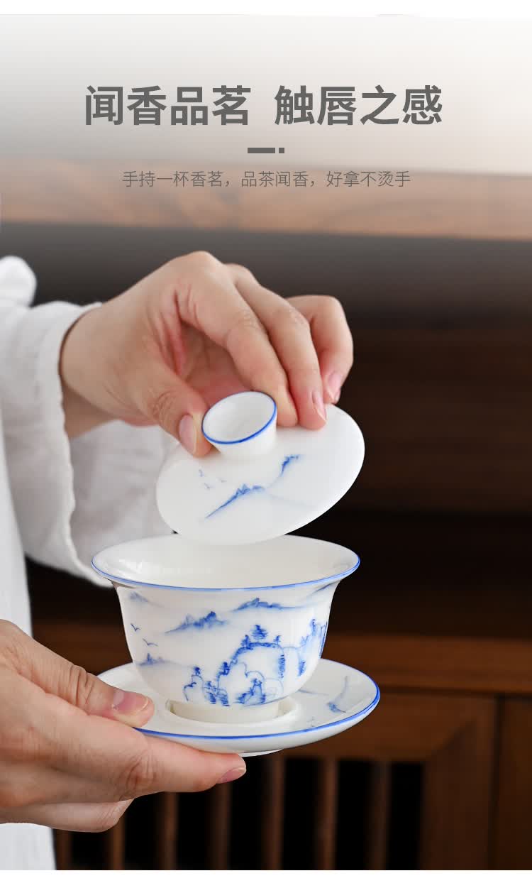 金镶玉 盖碗茶具 功夫茶手绘三才泡茶碗 羊脂玉瓷蓝线手绘层峦盖碗