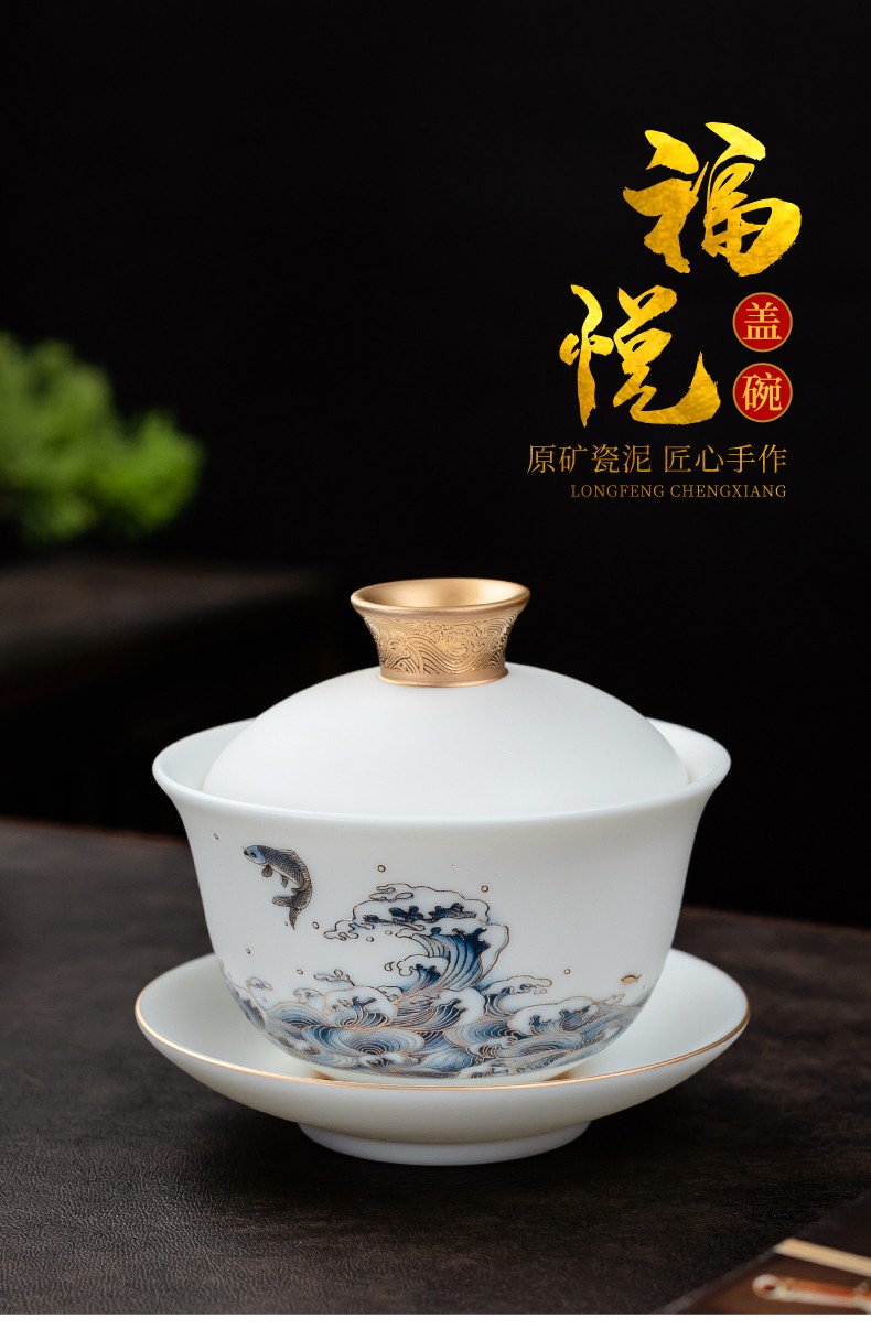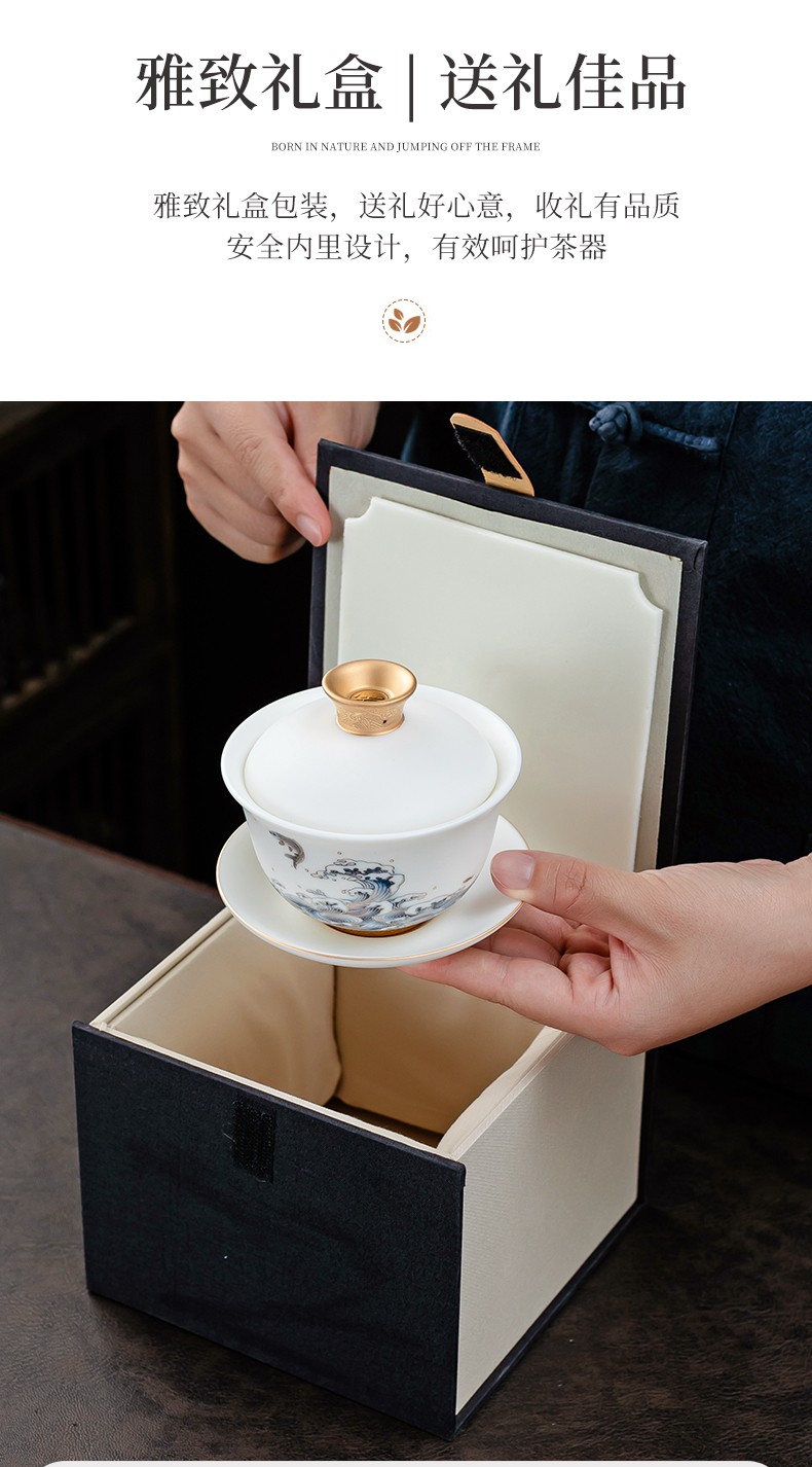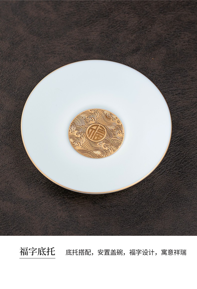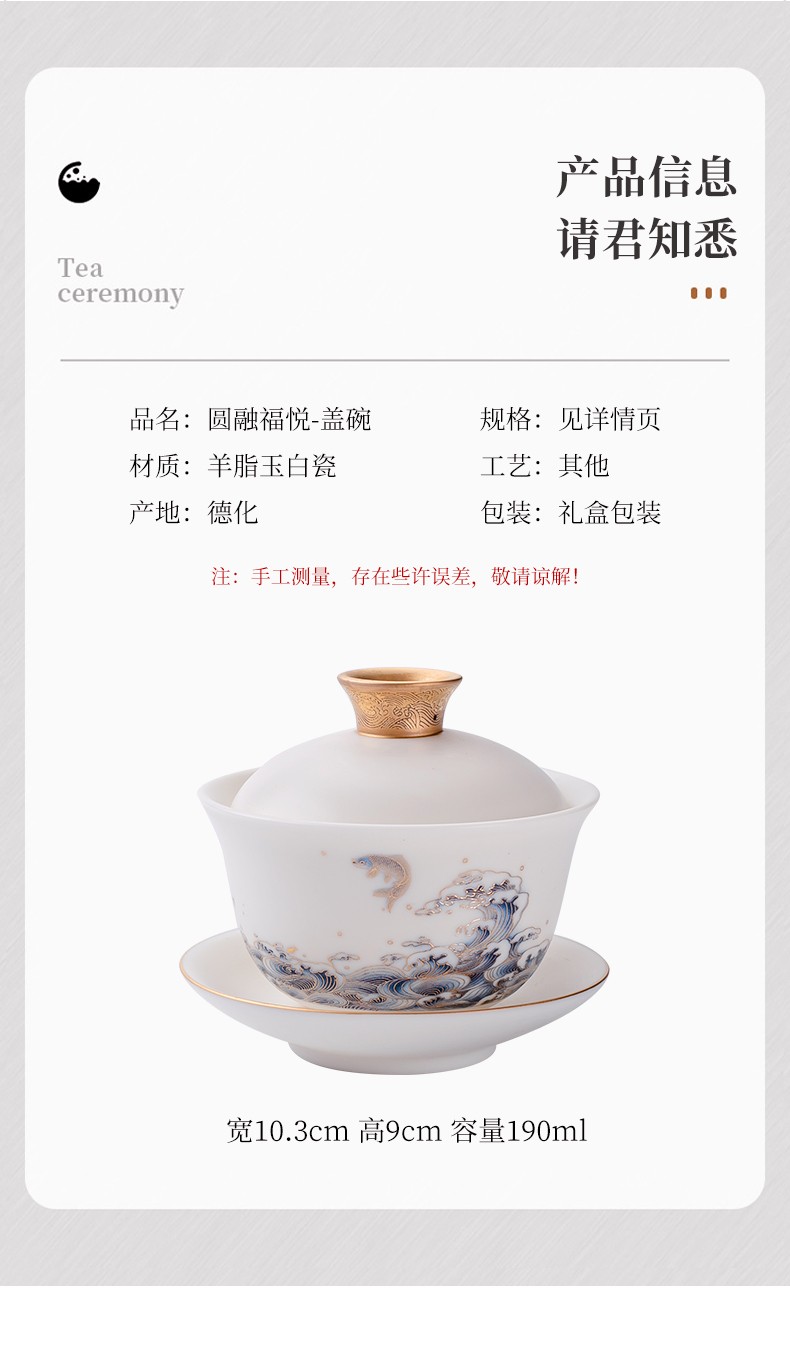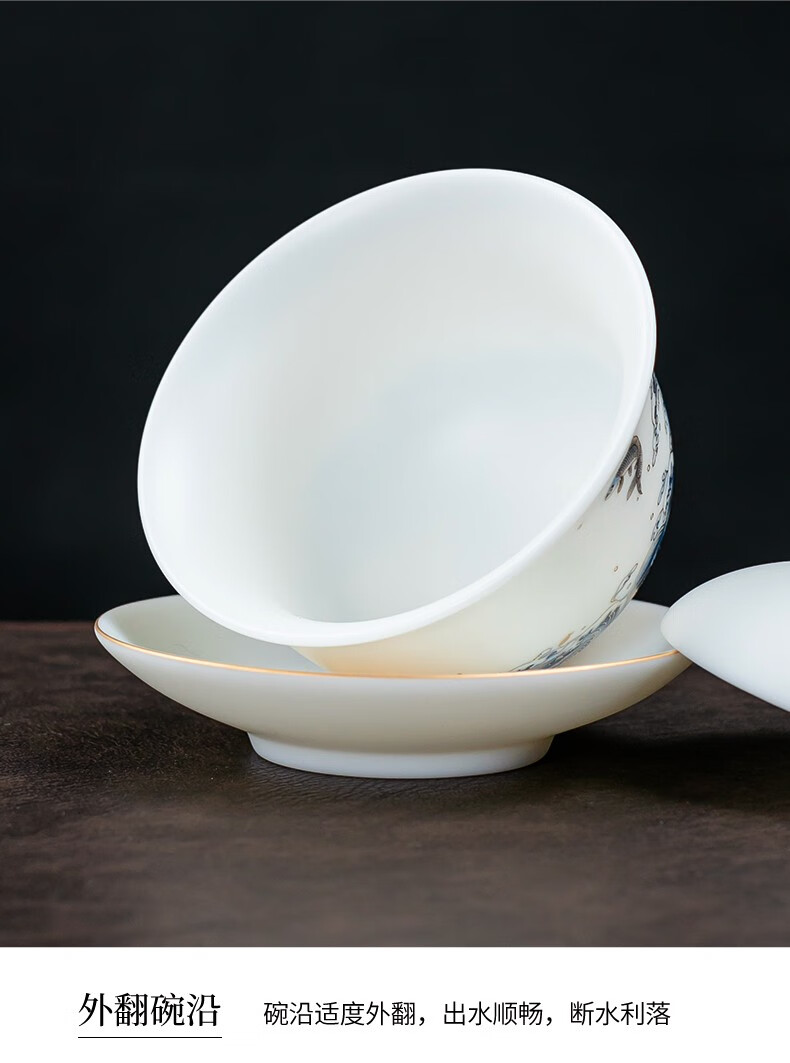 京峰阁 羊脂玉瓷圆融福悦盖碗功夫茶具套装办公室白瓷盖碗茶杯礼盒装容量160ml 圆融福悦盖碗