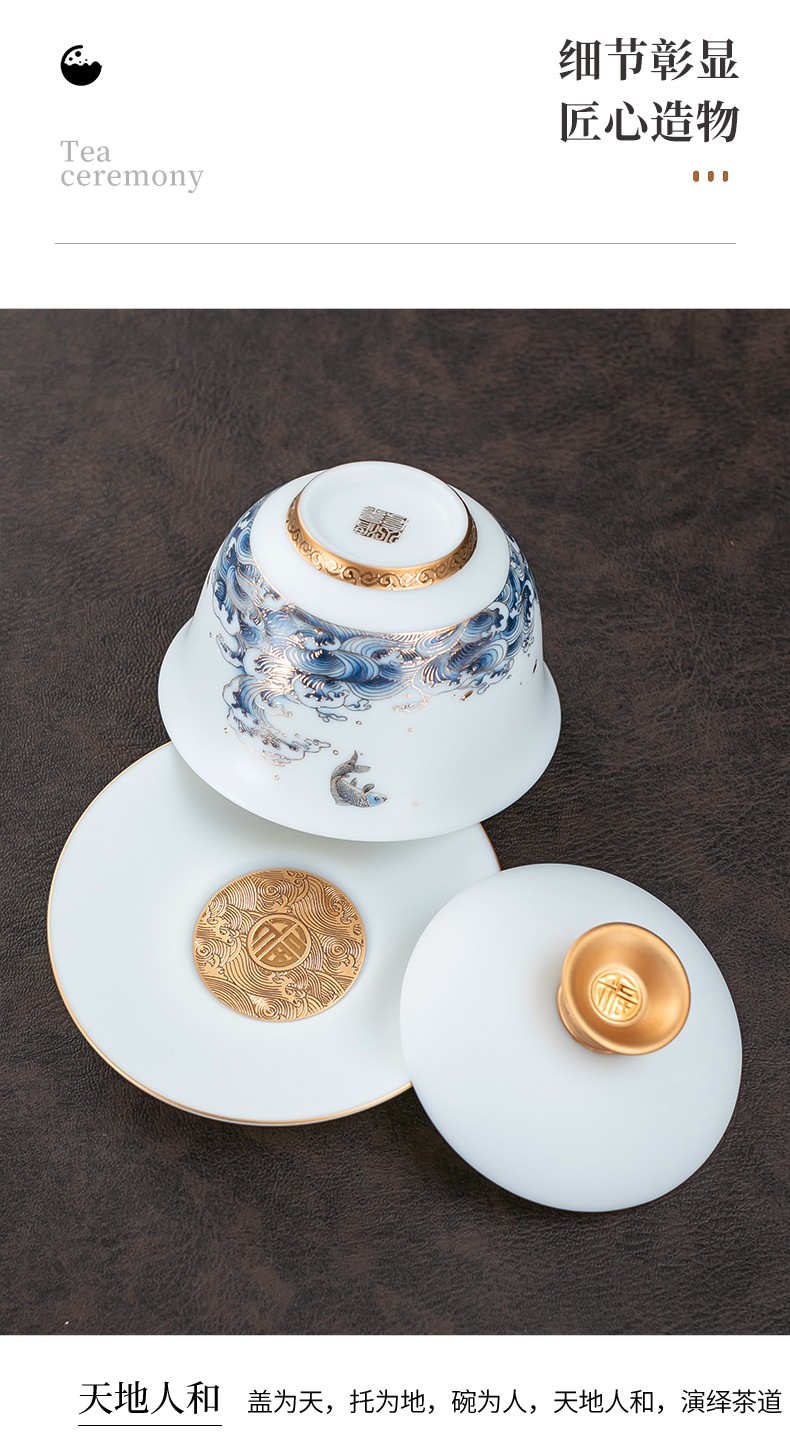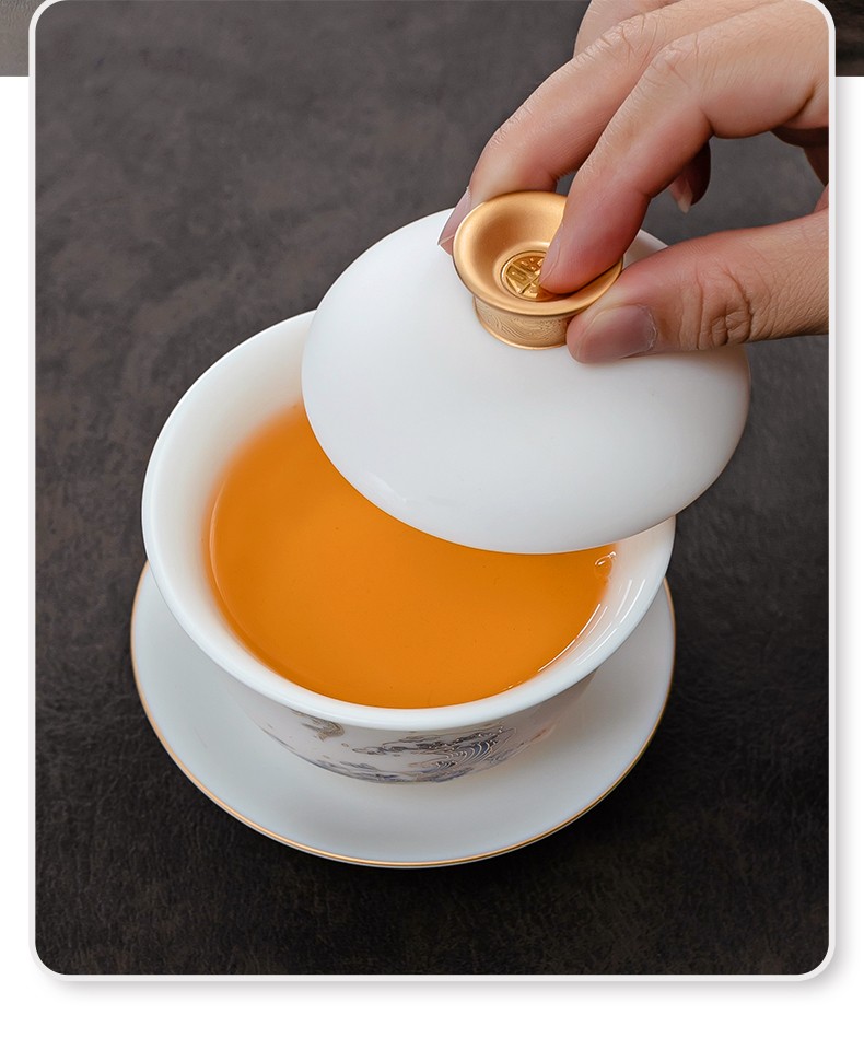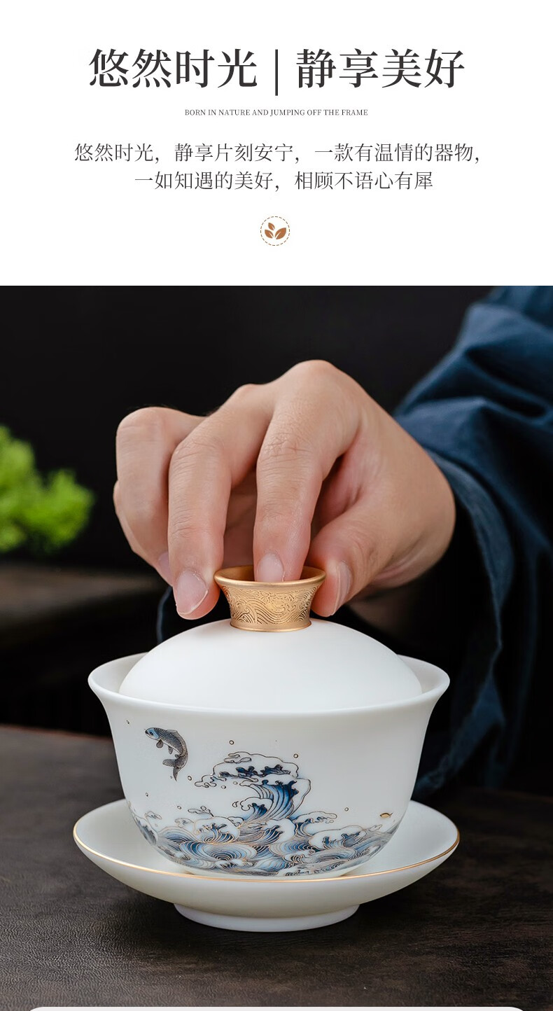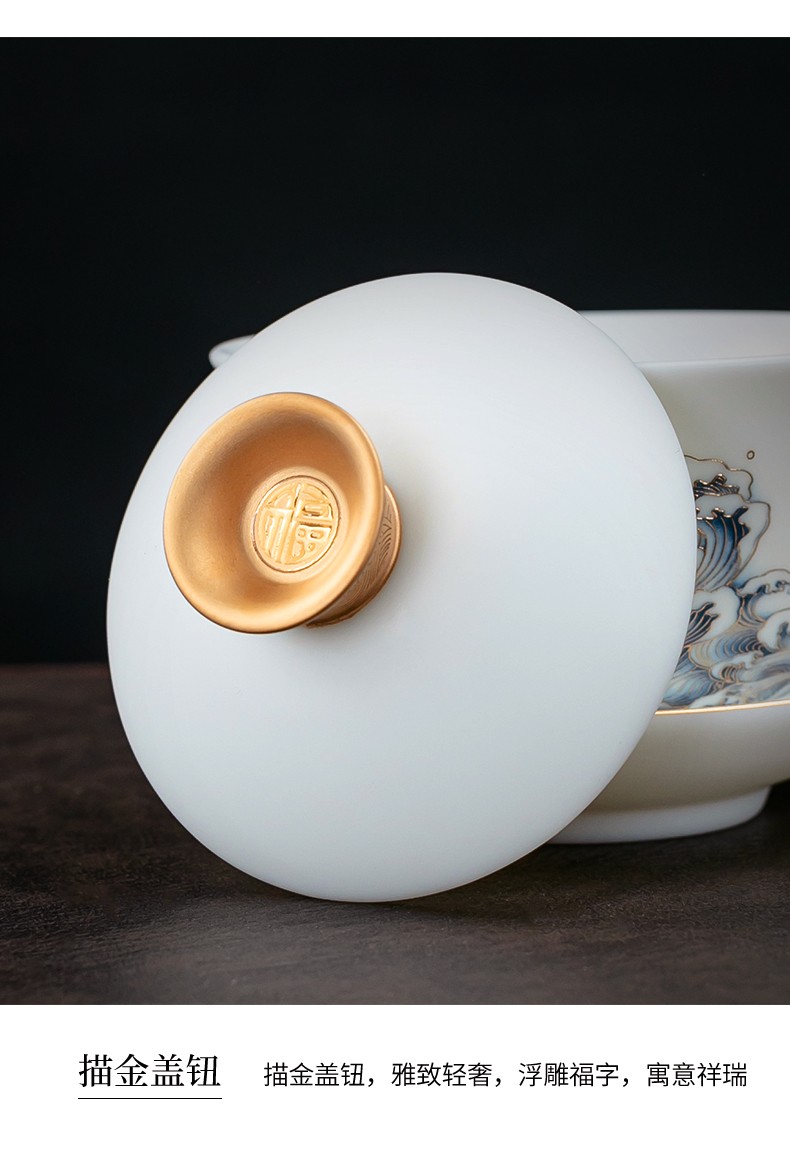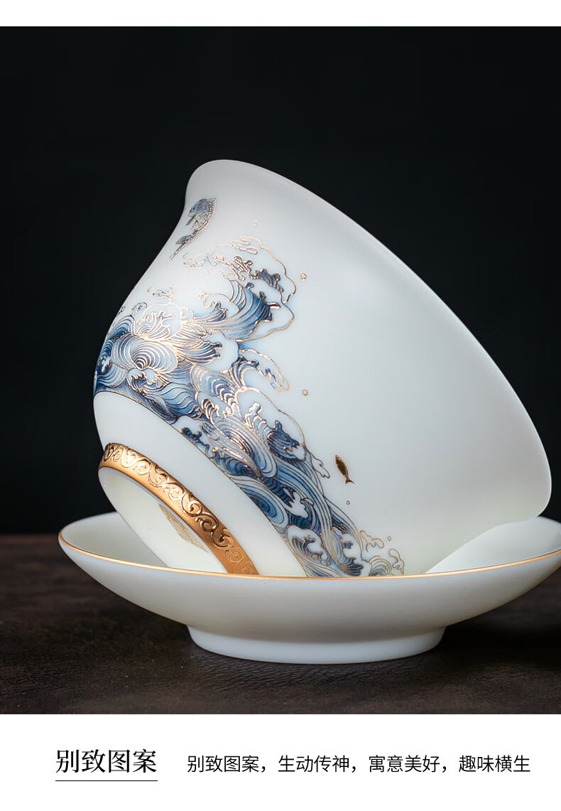 京峰阁 羊脂玉瓷圆融福悦盖碗功夫茶具套装办公室白瓷盖碗茶杯礼盒装容量160ml 圆融福悦盖碗