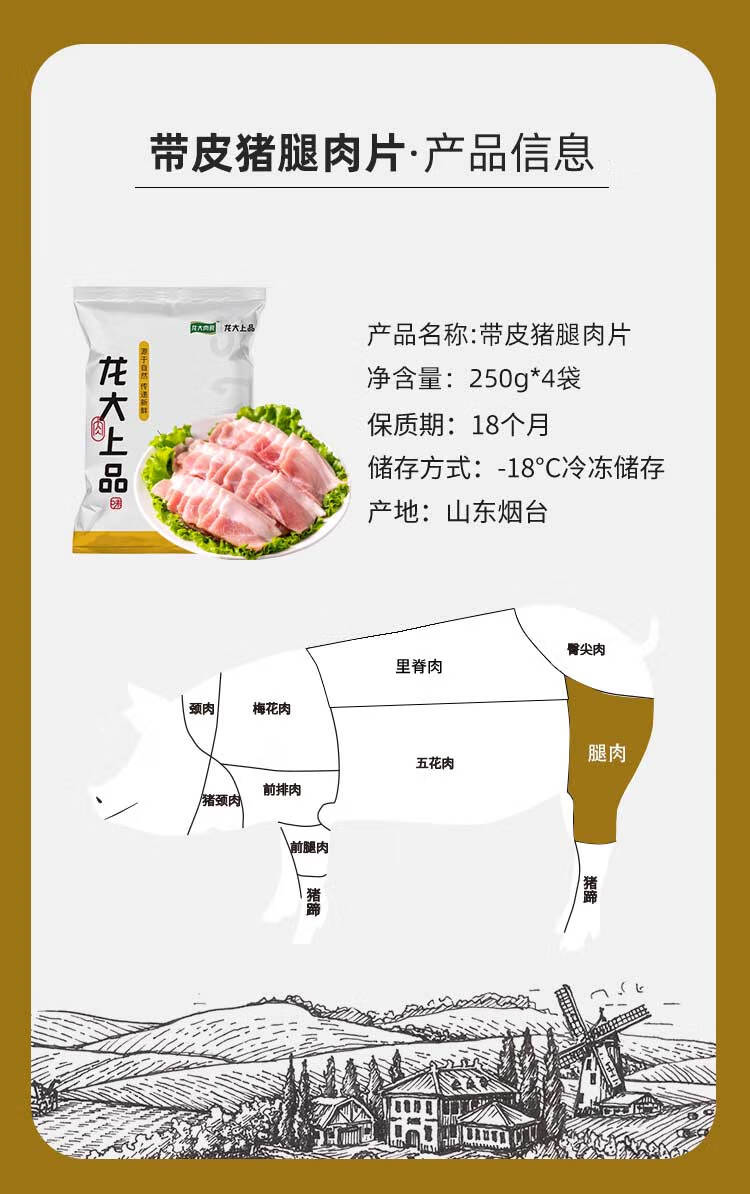 龙大肉食 猪腿肉肉片250g*4 出口日本级 带皮猪腿肉肉片烧烤食材 猪肉生鲜