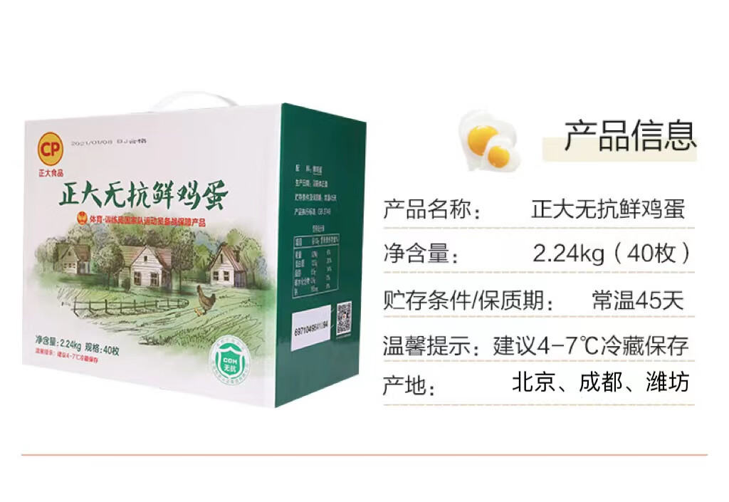 CP 正大 无抗鲜鸡蛋40枚 2.24kg 优质蛋白 早餐食材 礼盒装