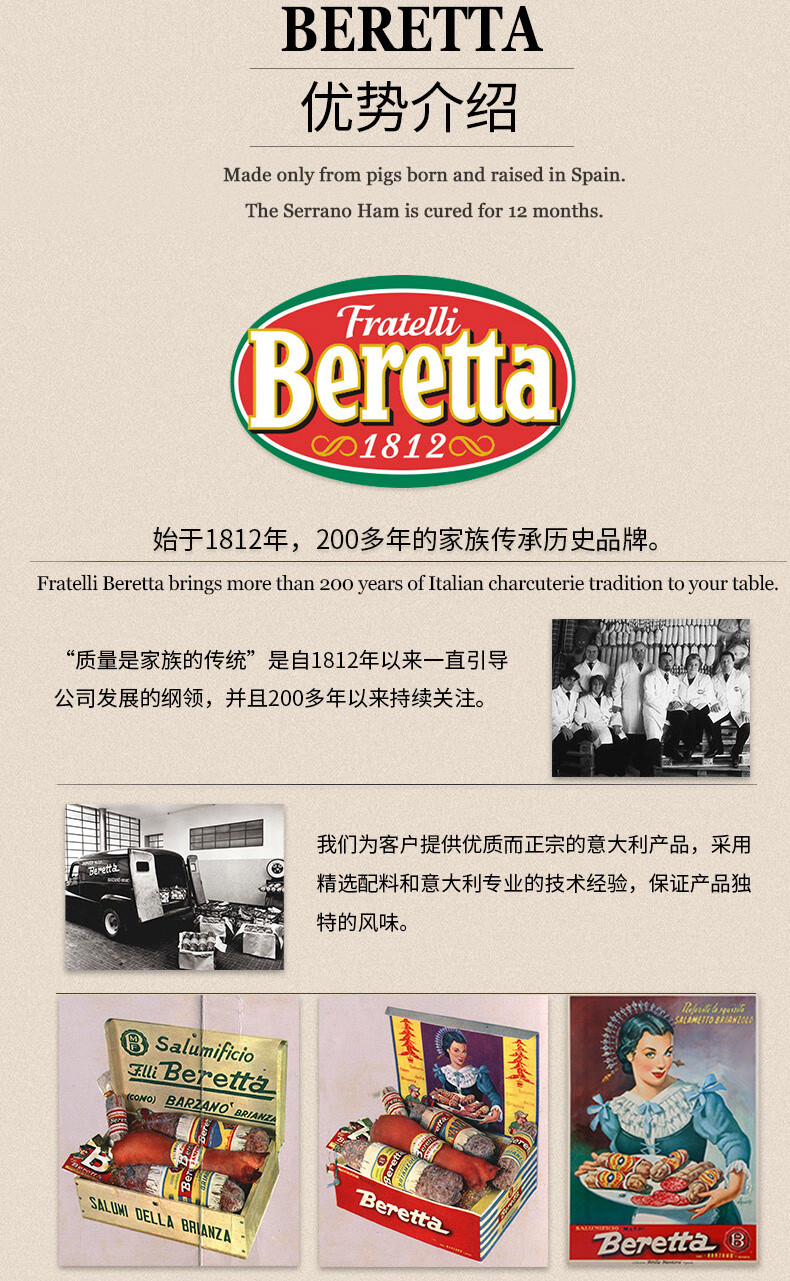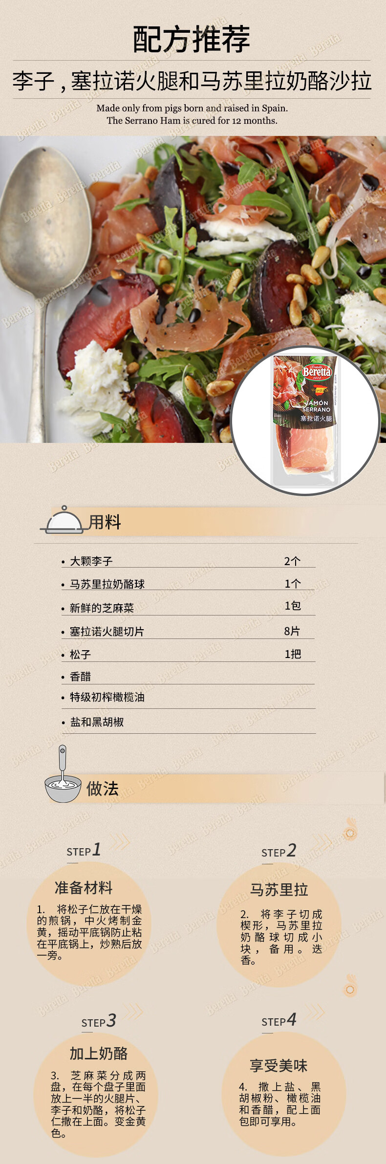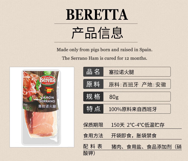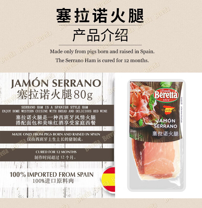 FRATELLI BERETTA西班牙塞拉诺火腿 进口原料风干火腿开袋即食生吃火腿早餐西餐80g