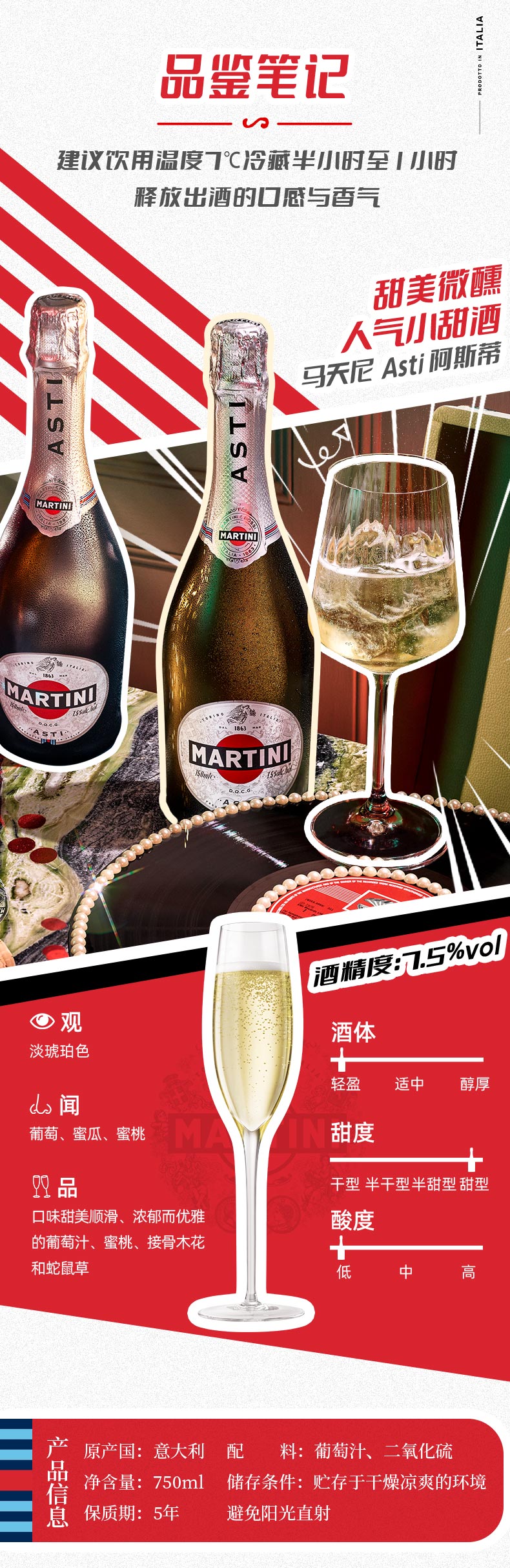 马天尼(Martini)意大利进口 Asti阿斯蒂甜型起泡酒750ml 莫斯卡托