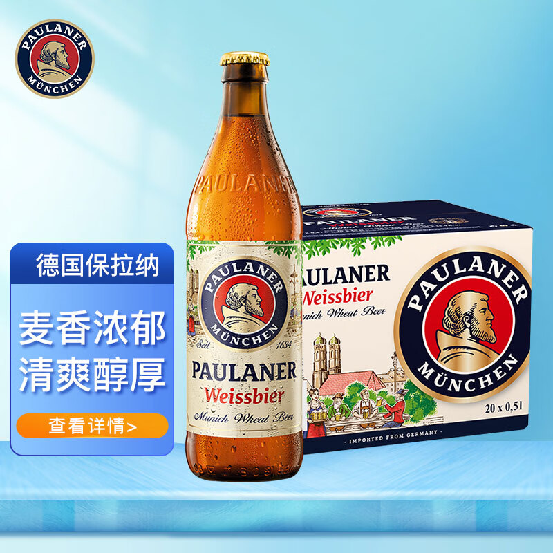 保拉纳(PAULANER )小麦白啤酒 330ml*24瓶 整箱装 德国原装进口