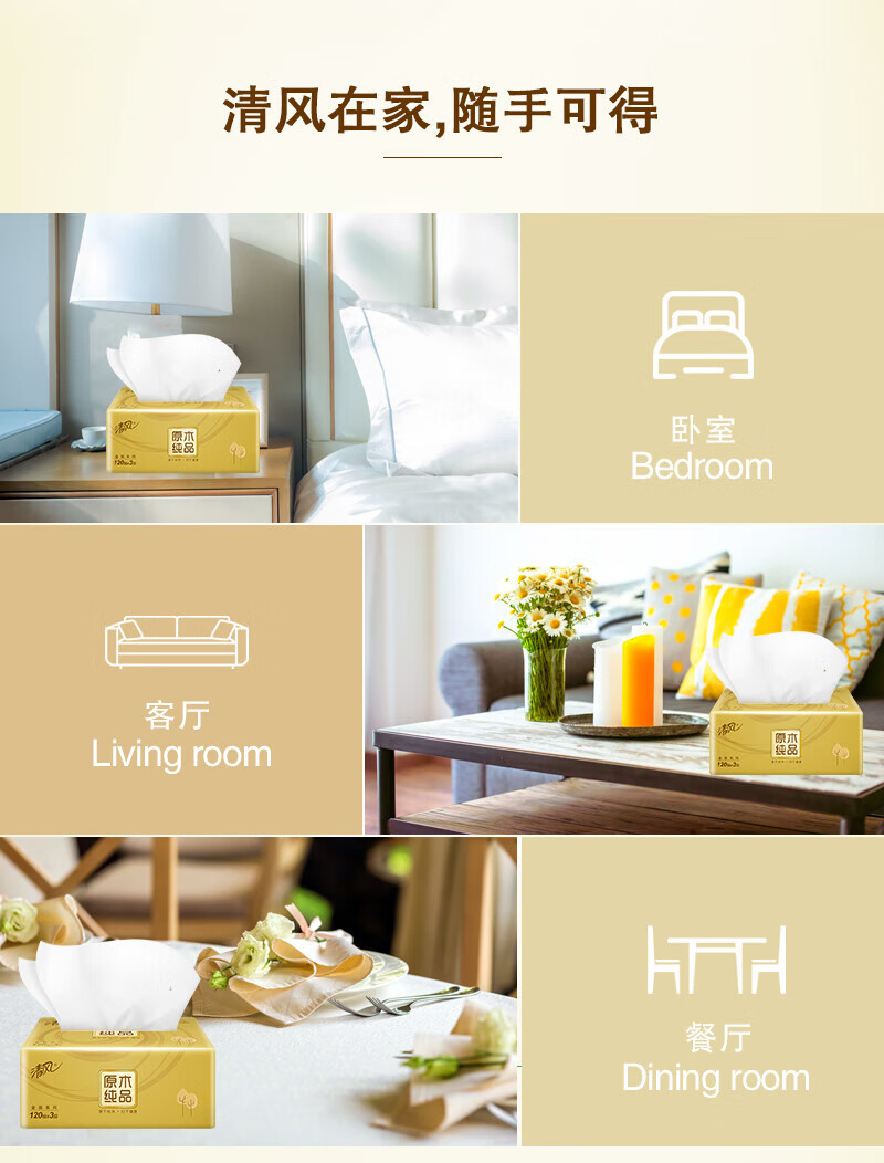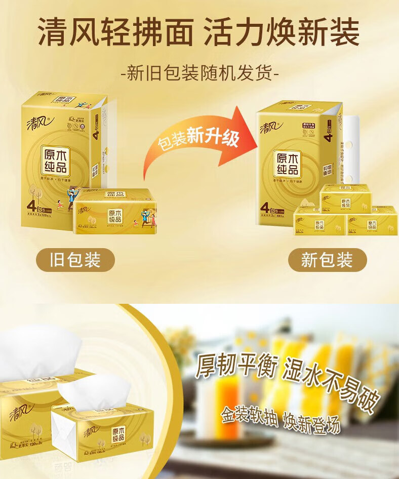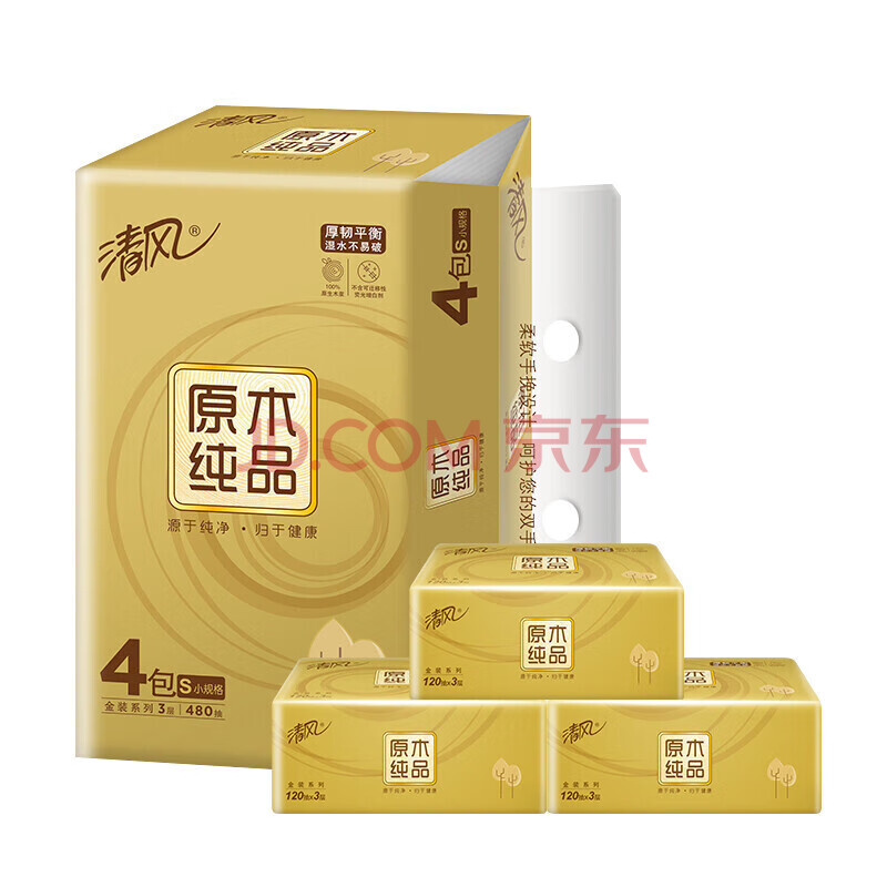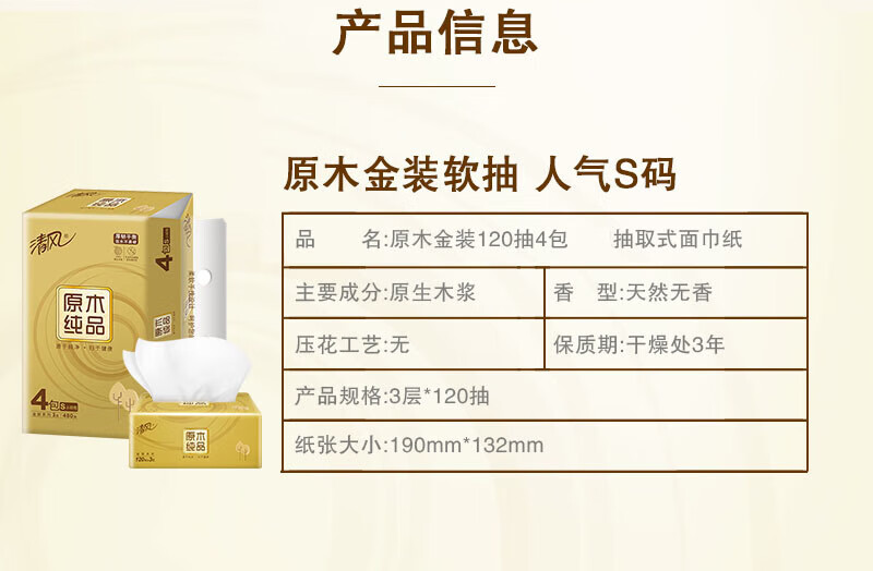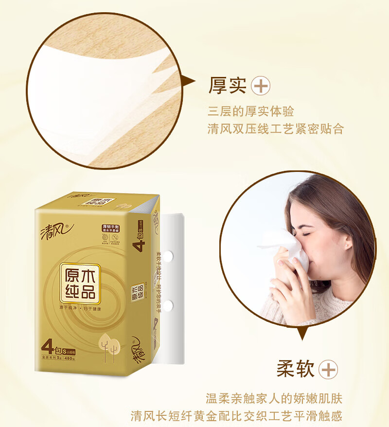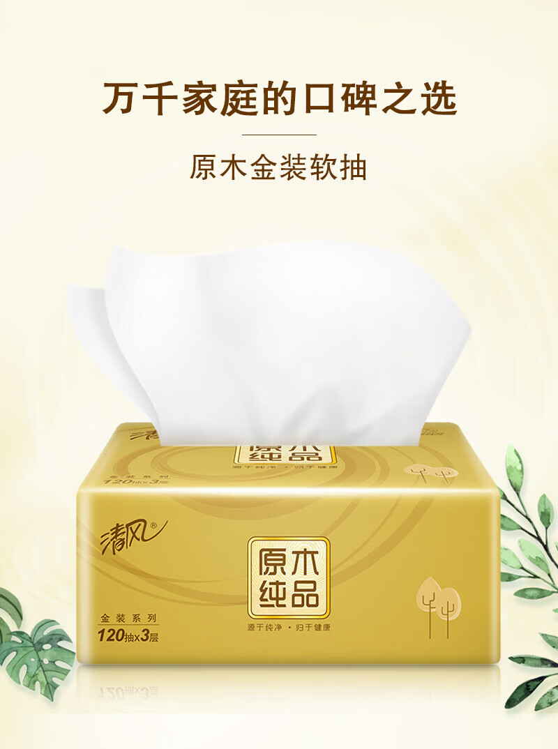 清风抽纸 原木纯品面巾纸12包*3层120抽餐巾纸卫生纸S码(共3提)
