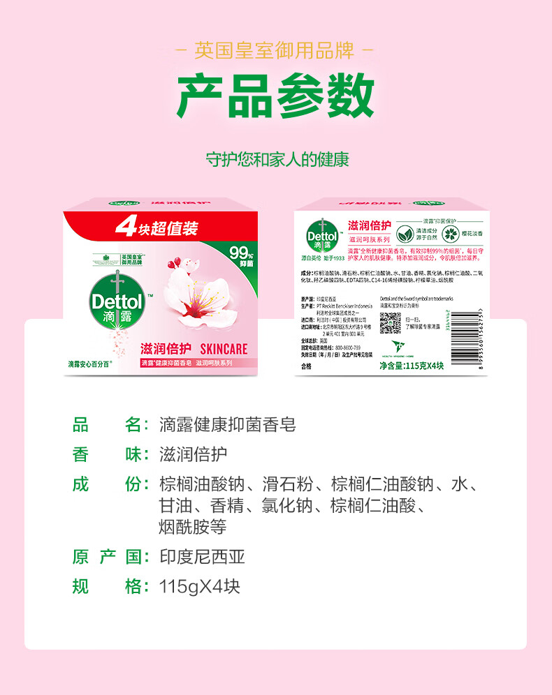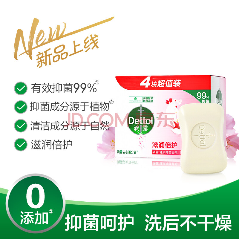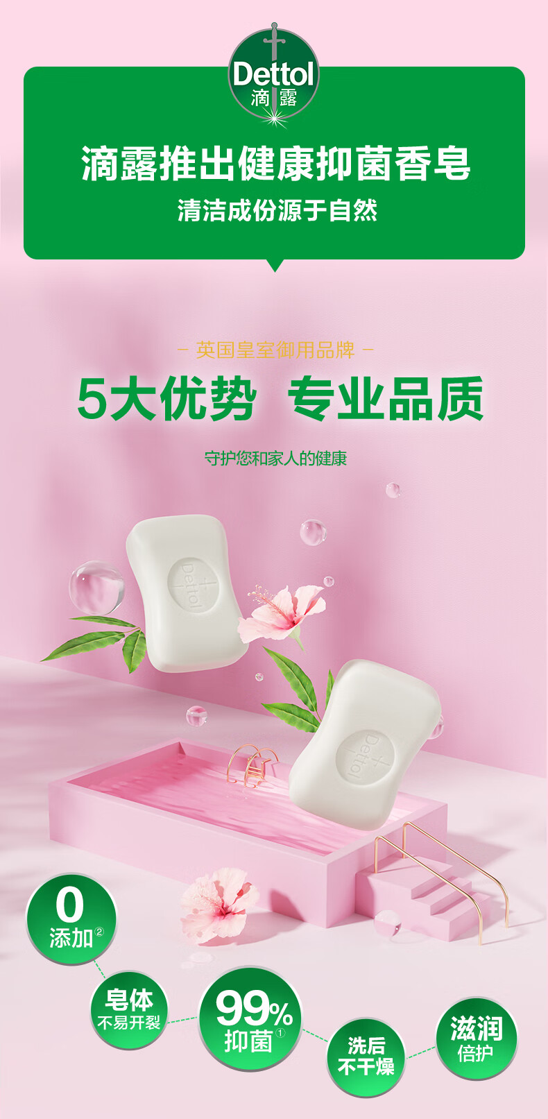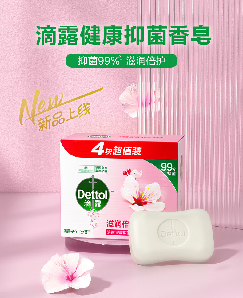 滴露Dettol健康香皂滋润倍护4块装 抑菌99% 洗手洗澡男士女士儿童通用