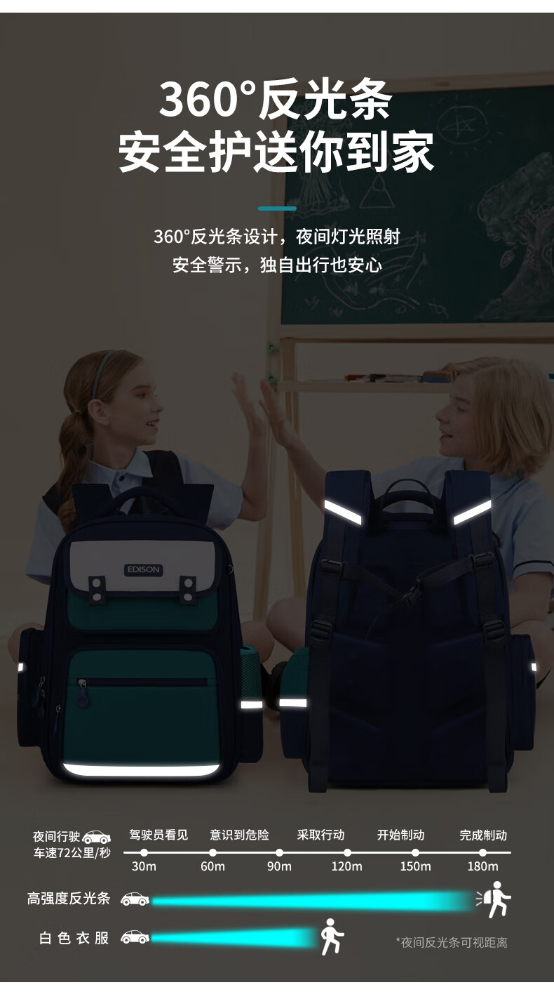 Edison爱迪生小学生书包男护脊反光大容量防泼水儿童背包2213-6s天蓝