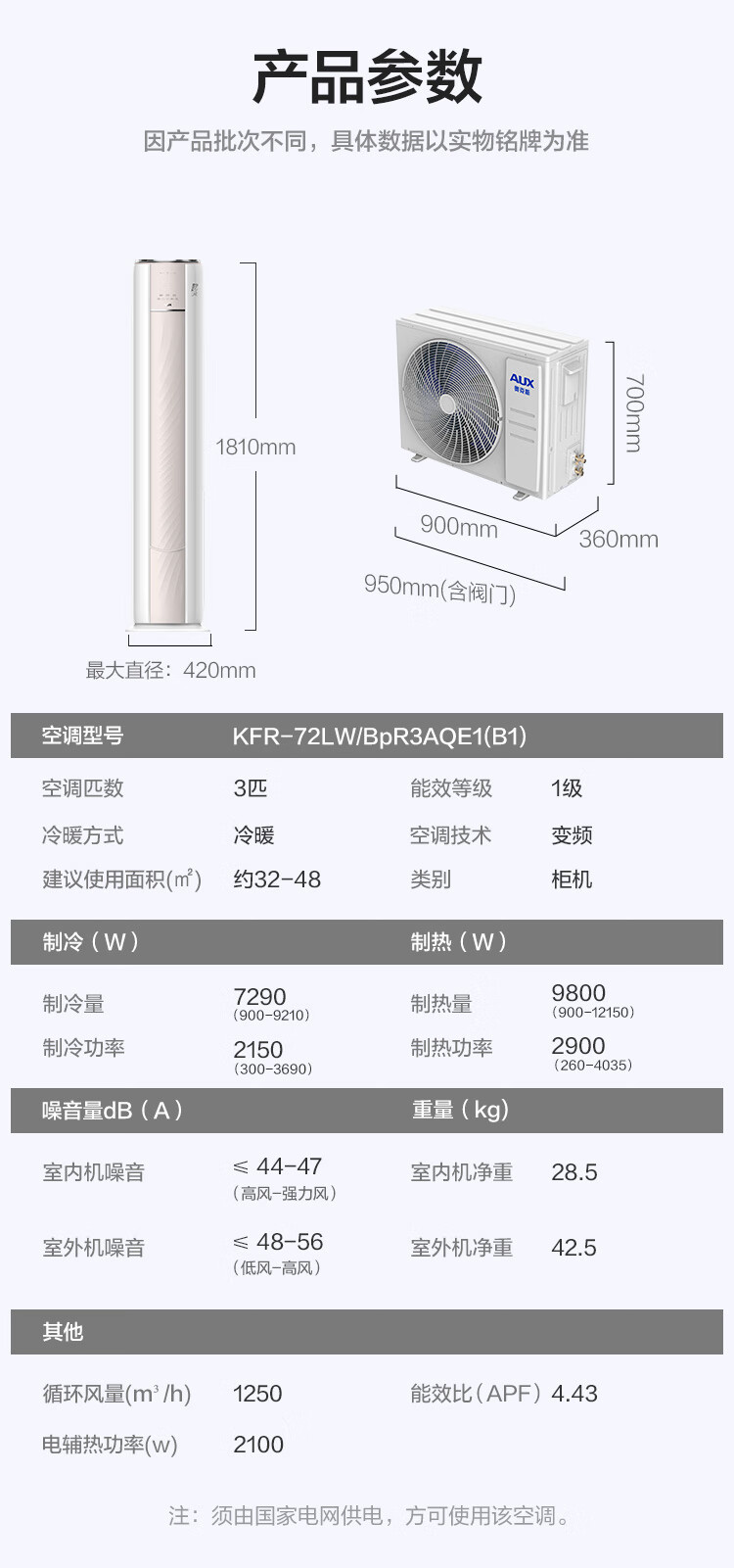奥克斯(AUX)立式空调 3匹柜机 一级能效柜机 客厅节能 WIFI智控 超远风 升级大风口(KFR-72LW/BpR3AQE1(B1))