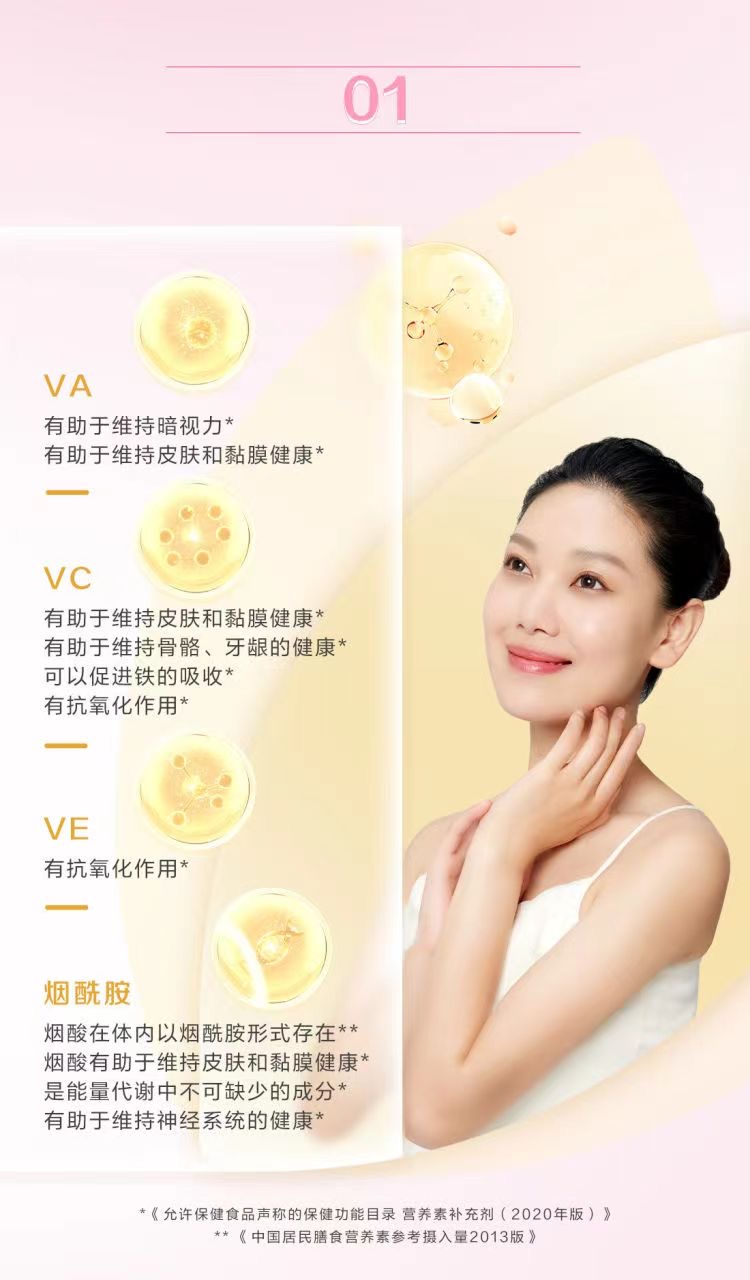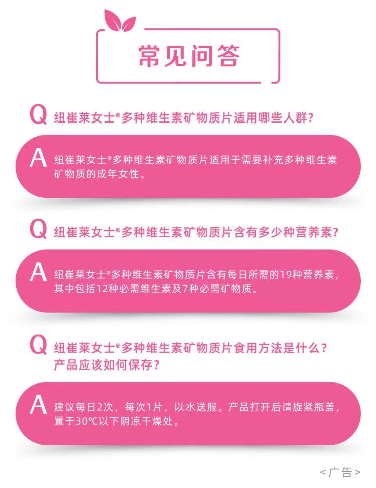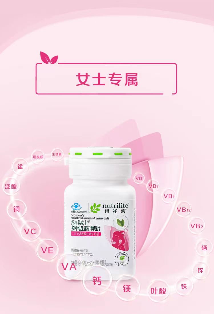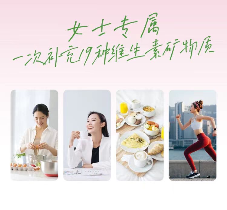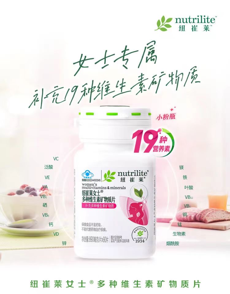 女士专属,含有每日人体所需的19种营养素,其中包括12种必需维生素及7种必需矿物质。