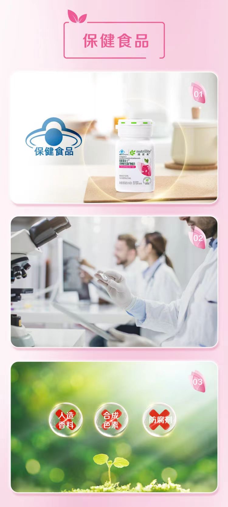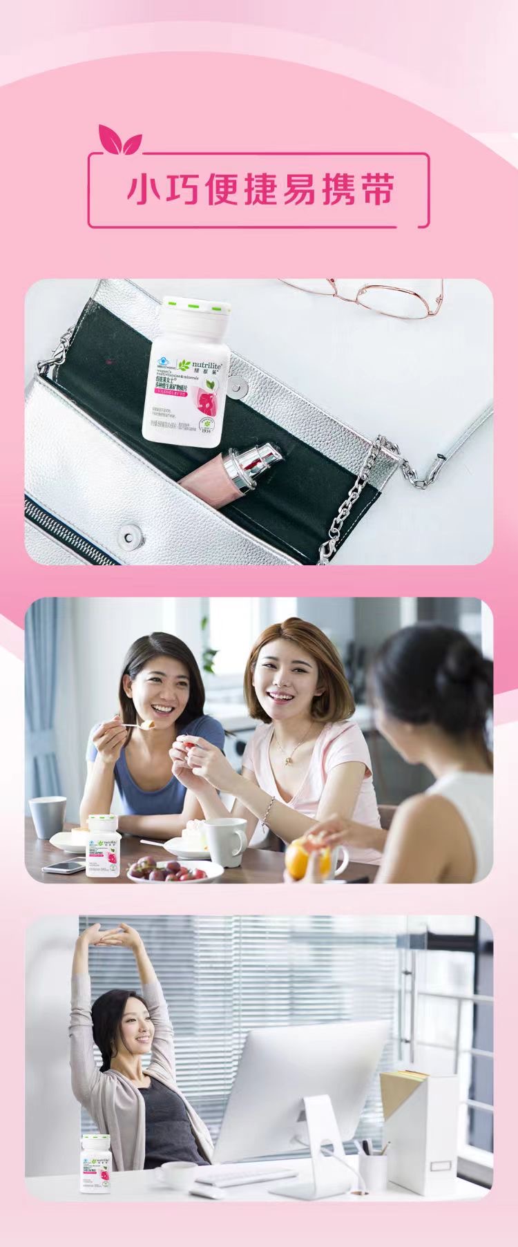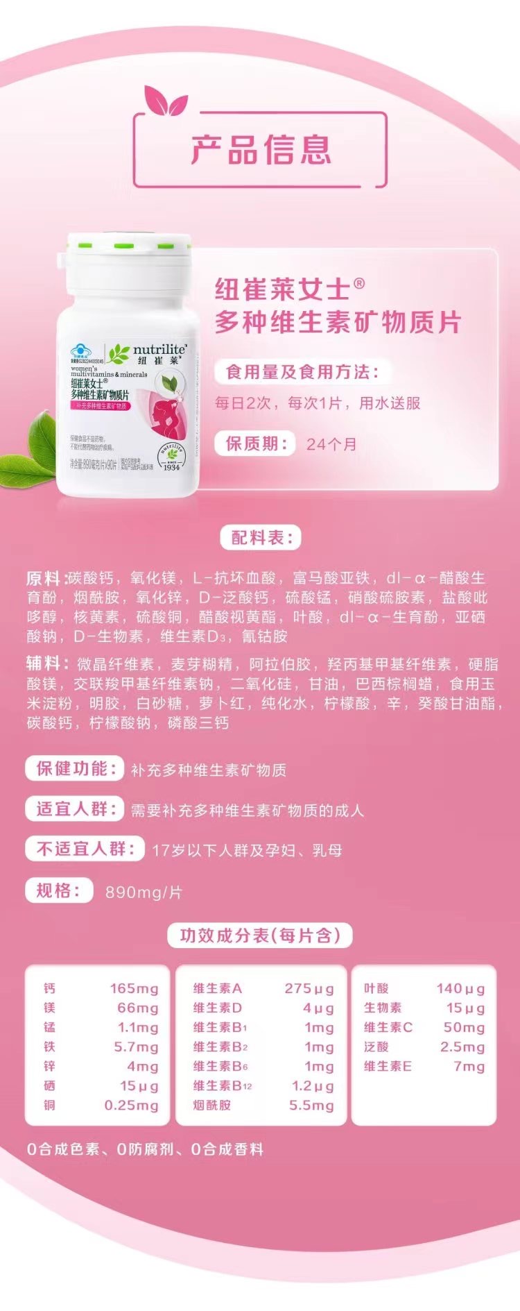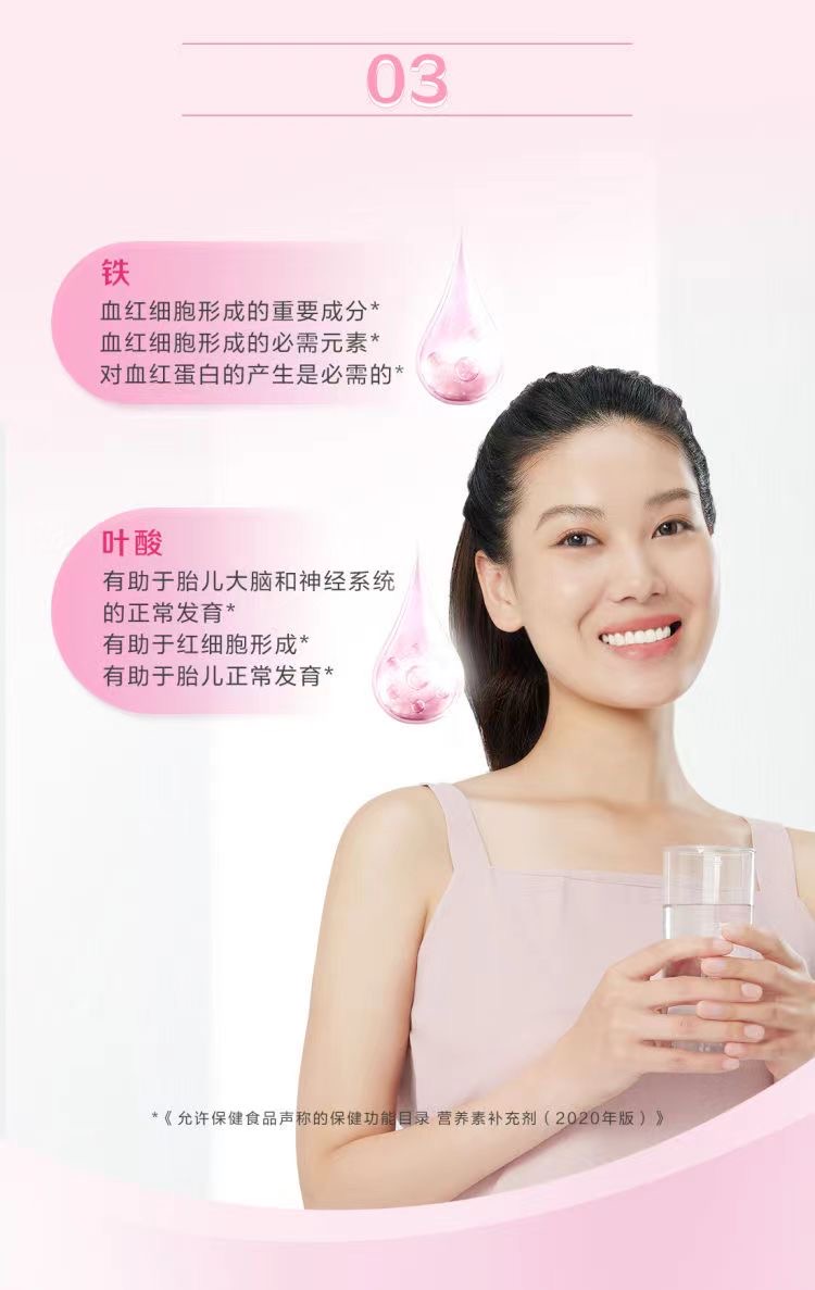女士专属,含有每日人体所需的19种营养素,其中包括12种必需维生素及7种必需矿物质。