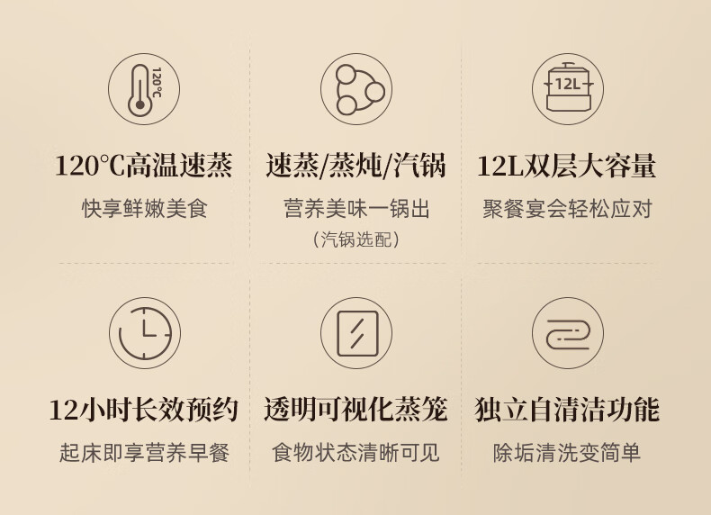 速蒸模式,30秒快出120℃高温蒸汽,高温更锁鲜 透明上盖可随时观察食物加热状态 12小时智能预约,独立自清洁功能