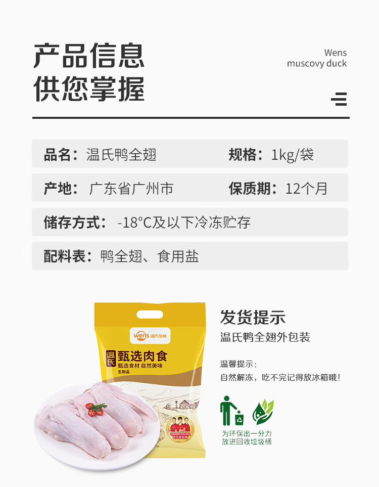 温氏 鸭全翅1kg 冷冻鸭三节翅 鸭翅鸭肉生鲜鸭翅膀三节鸭全翅整只