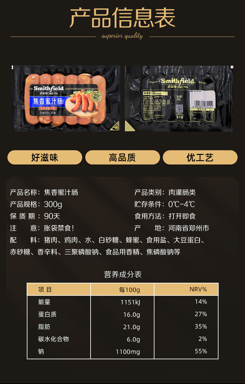 史蜜斯(Smithfield)焦香蜜汁肠300g 冷藏美式香肠烤肠热狗肠 不添加淀粉