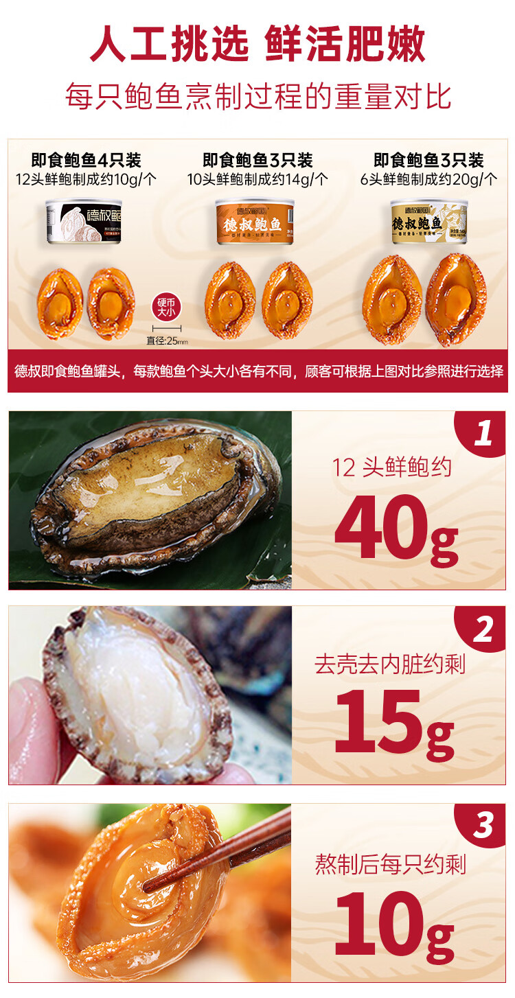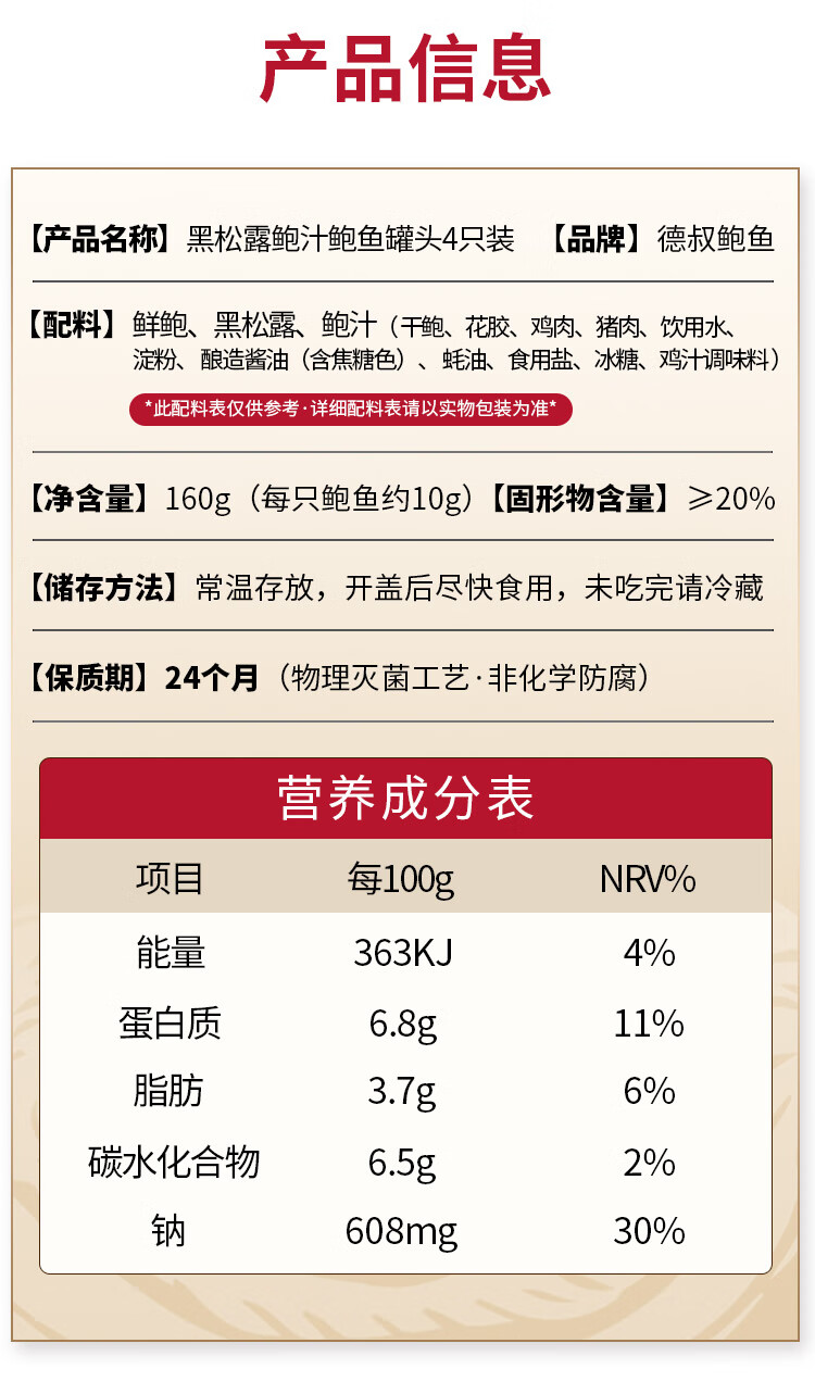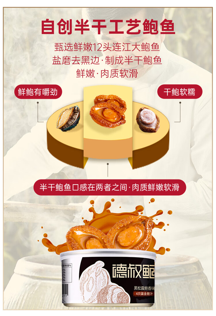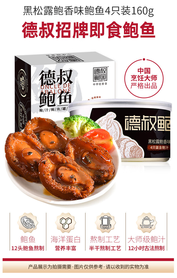 德叔鲍鱼即食熬制鲍鱼罐头4只装160g黑松露味鲍汁捞饭海鲜熟食儿童早餐