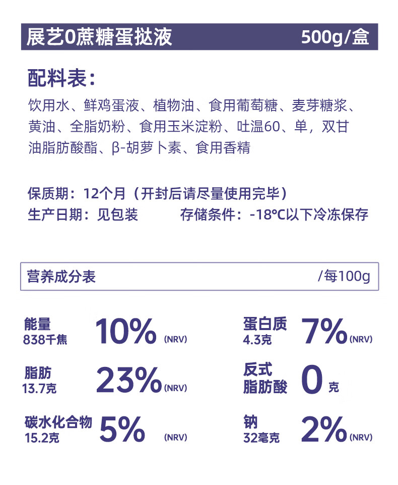 展艺 0蔗糖蛋挞液 450g 新鲜蛋液0反式脂肪酸烘焙原料半成品