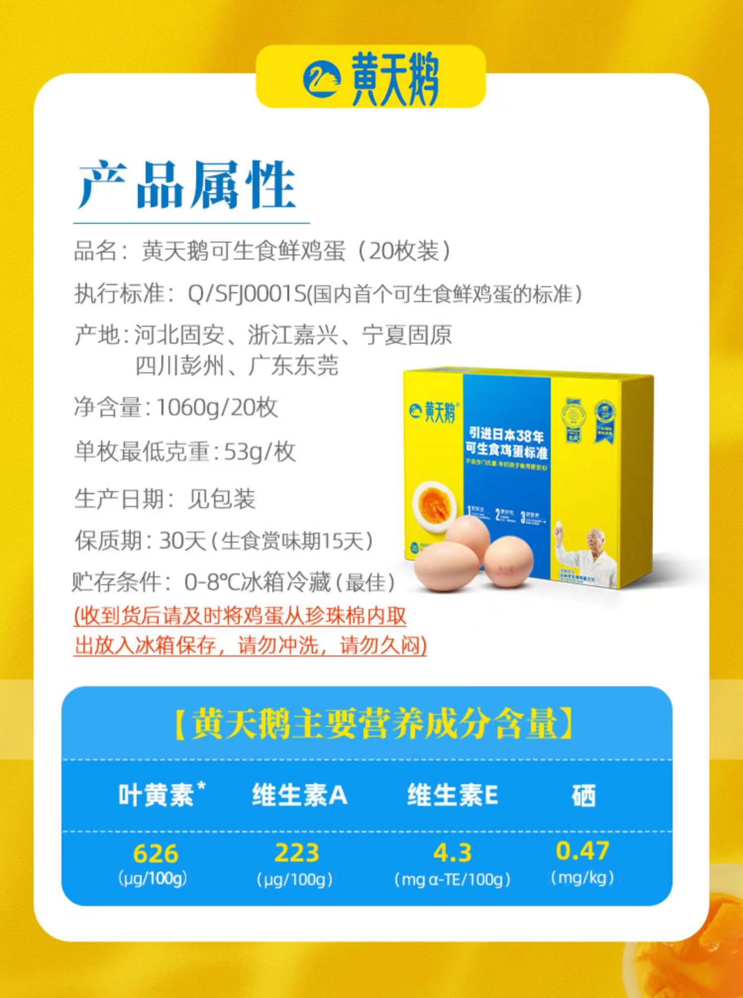 (华虹宏力)【黄天鹅】可生食无菌无抗生素无激素鸡蛋53g*20枚+可生食无菌无抗生素无激素鸡蛋53g*24 枚