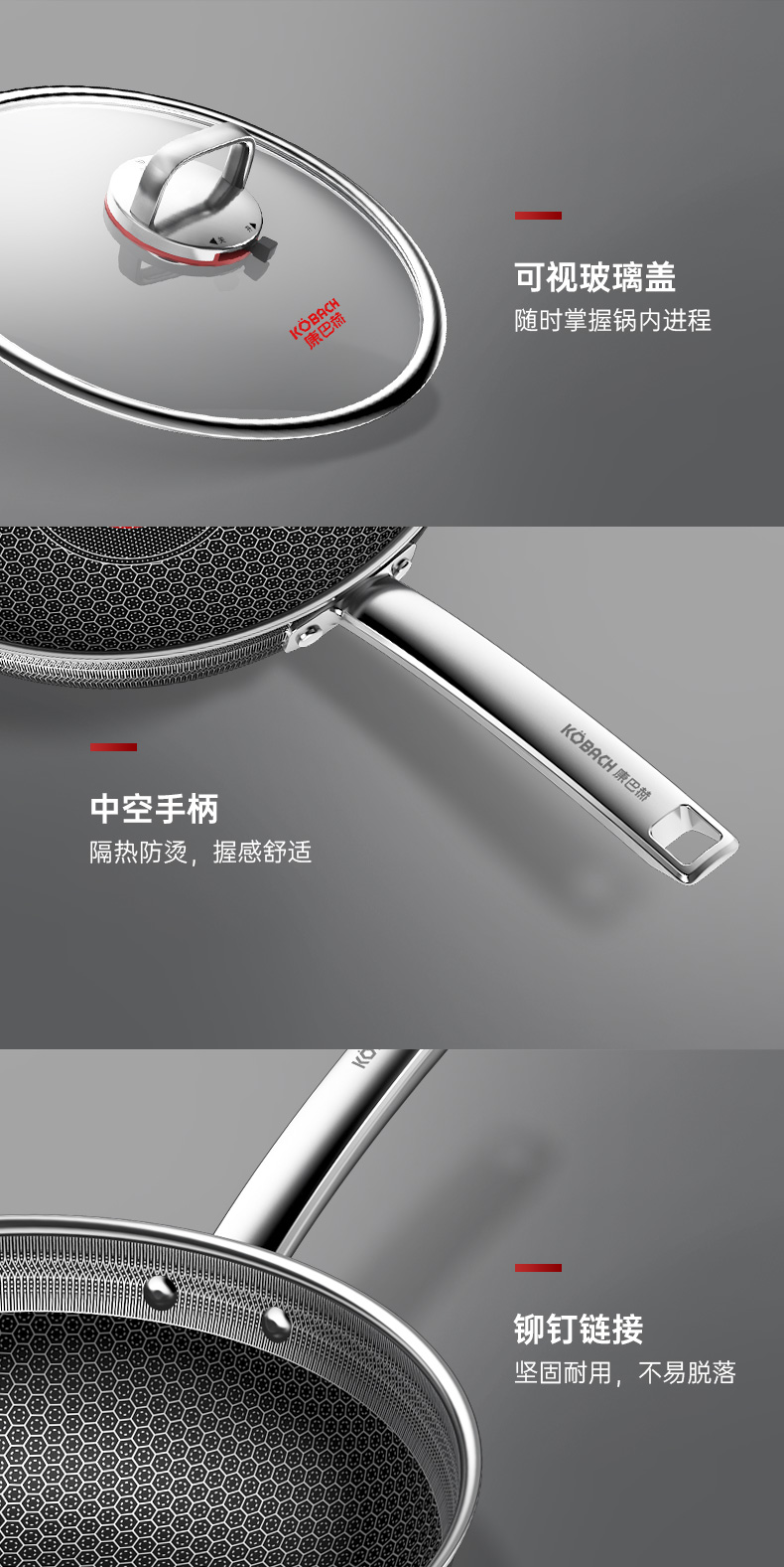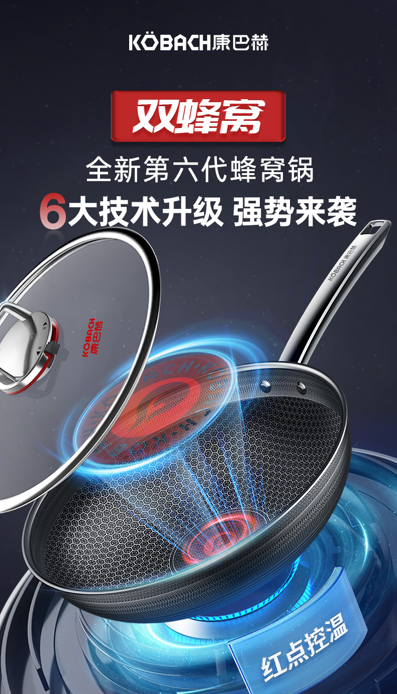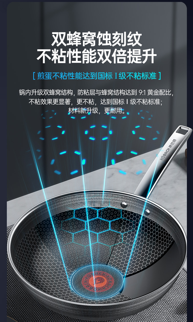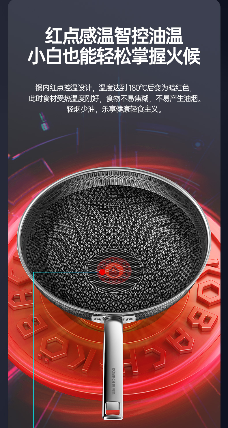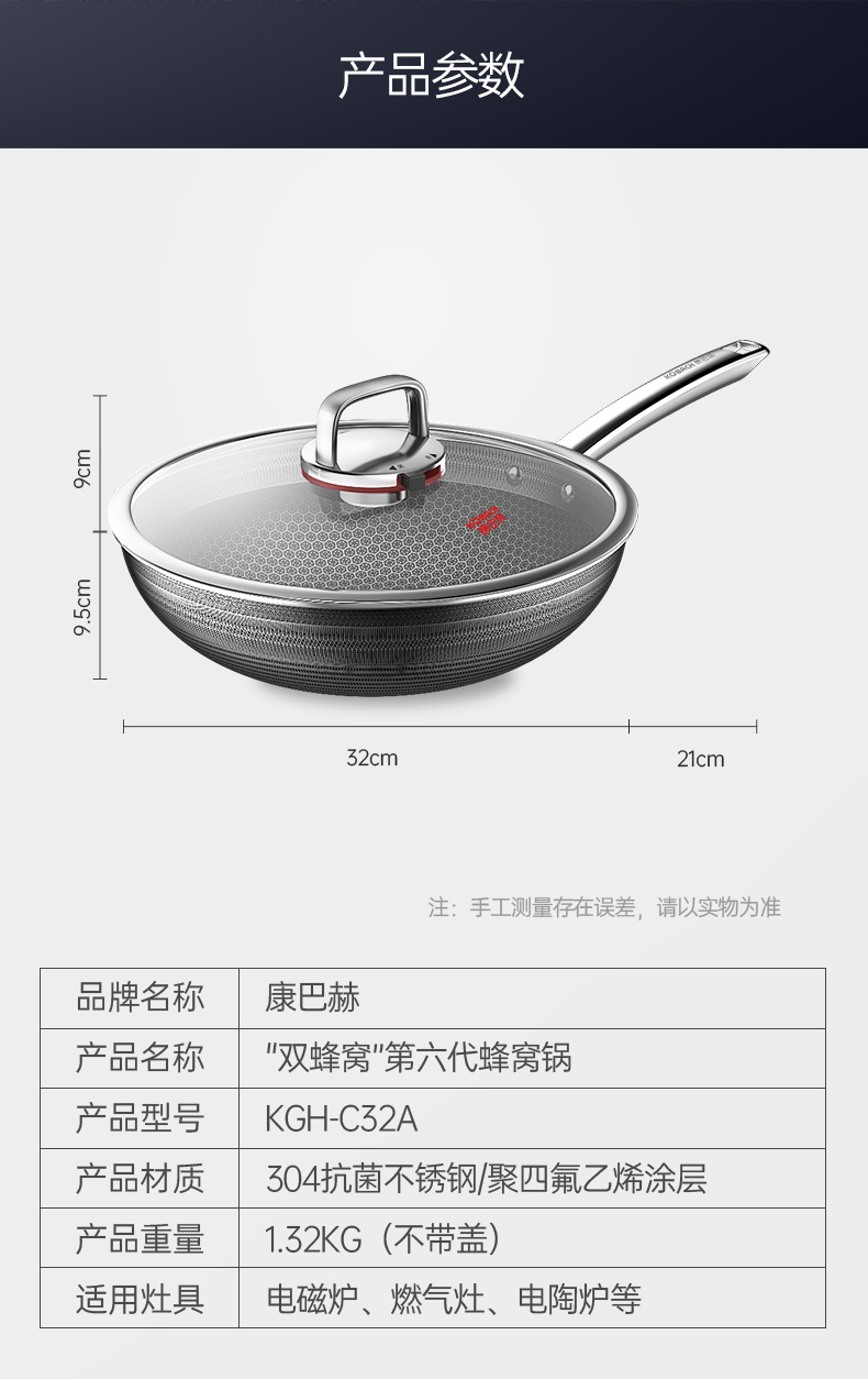 【康巴赫】六代炒锅不粘锅抗菌不锈钢炒菜锅32cm双蜂窝平底锅红点电磁炉通用