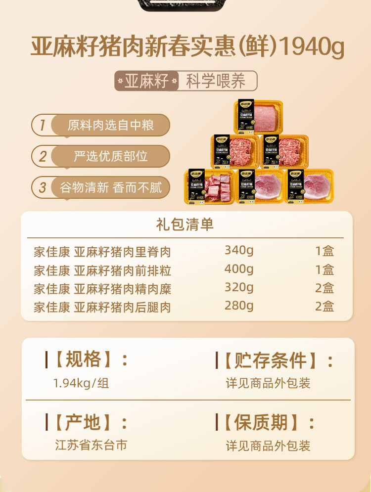【中粮家佳康】亚麻籽猪肉新春实惠组合1940g