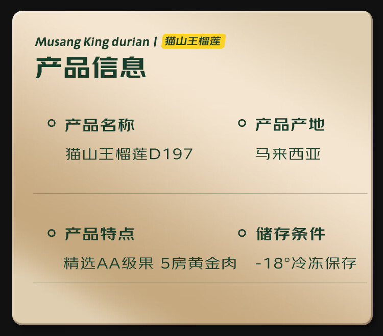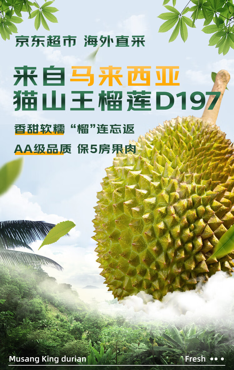 京东超市猫山王榴莲马来西亚D197液氮冷冻 AA果4.5-5.0斤【保5房】