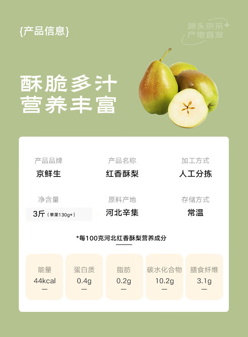 京鲜生 河北红香酥梨 净重3斤 单果130g+ 生鲜水果 源头直发