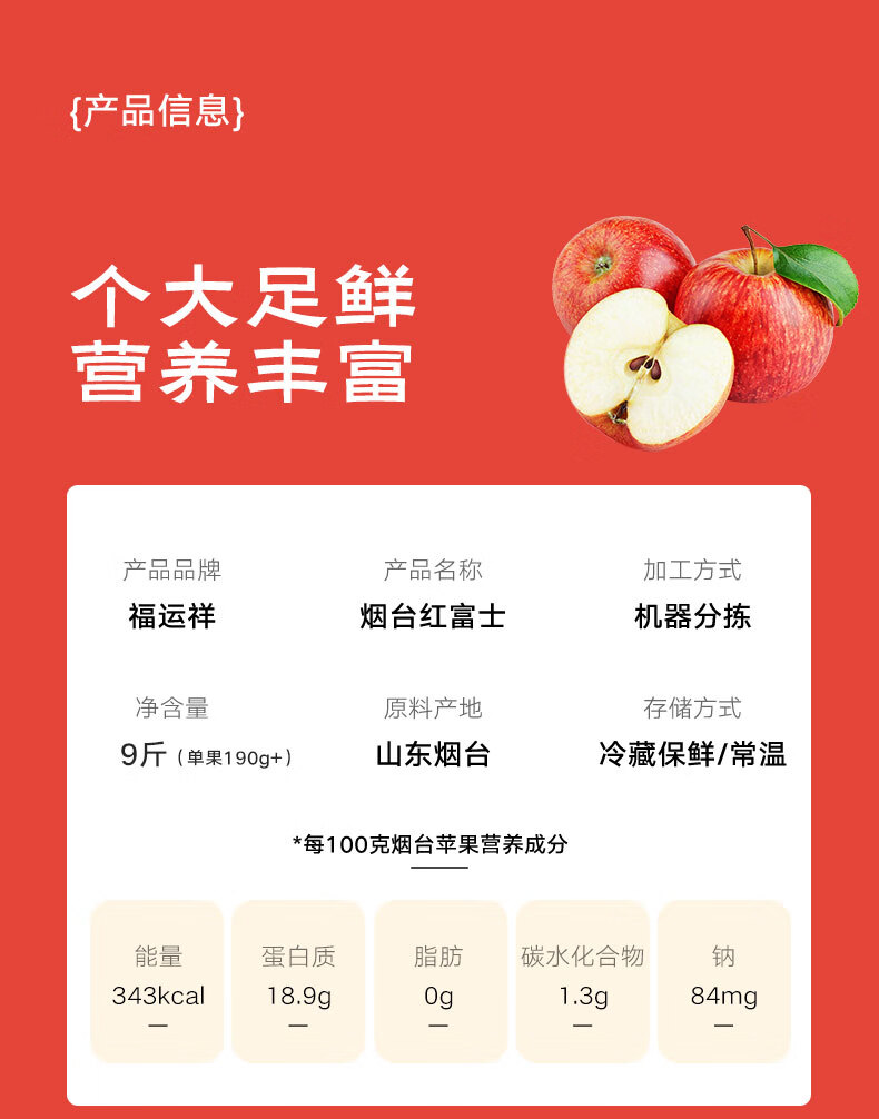 福运祥山东烟台栖霞红富士苹果产地直发甄选9斤装80-85mm单果190g+包 邮