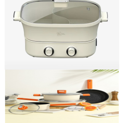 米技生活 鸳鸯火锅 EMP-L6810+D德世朗“橙”精铁不粘锅四件套