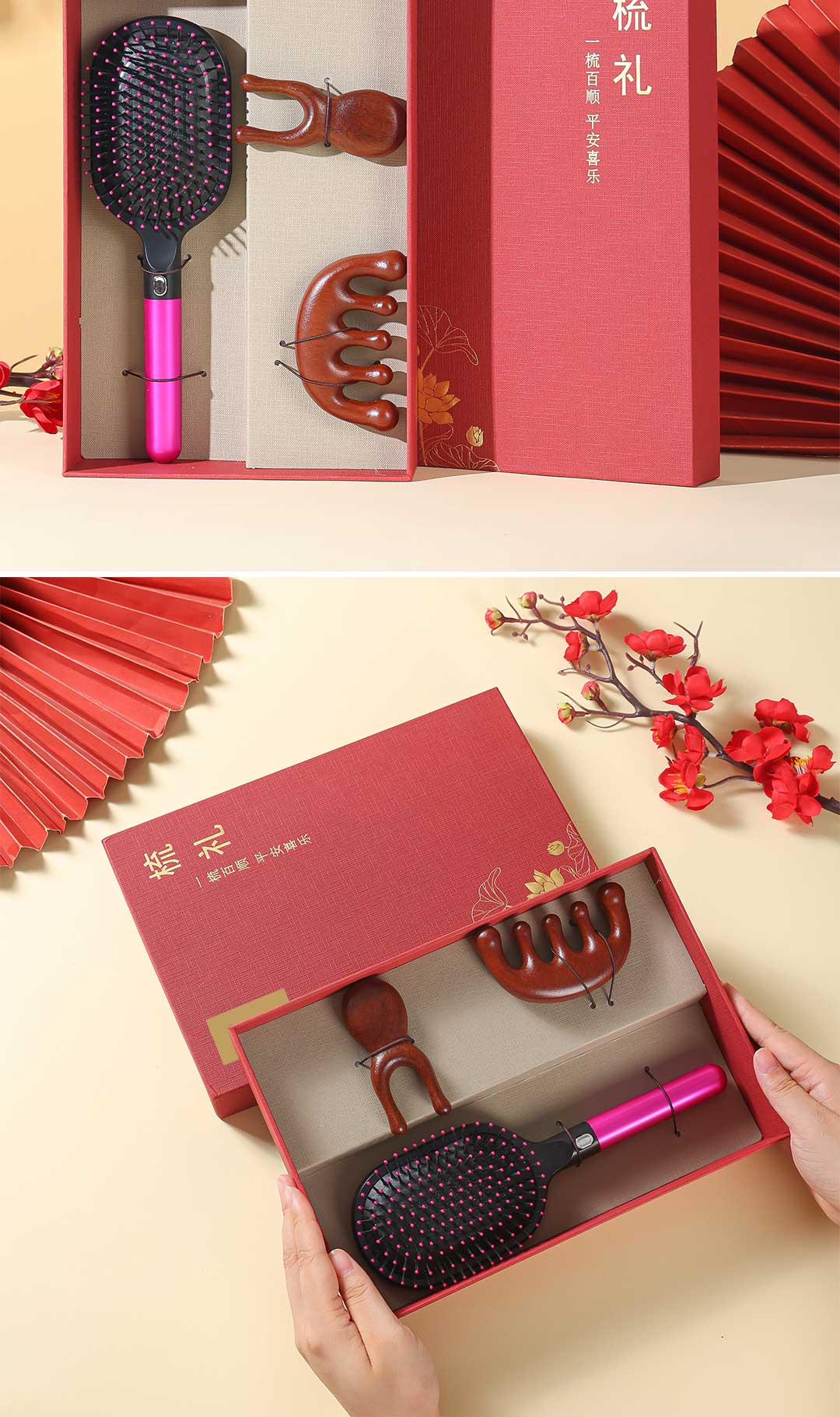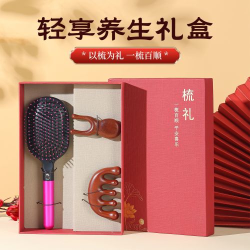 3. 精致外观:红盒包装喜庆典雅,图案点缀增添韵味;梳具色彩搭配和谐,气垫梳粉紫配色亮眼,木质件纹理自然,颜值与质感兼具。