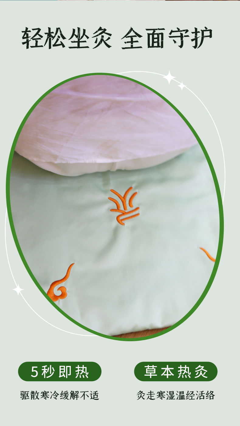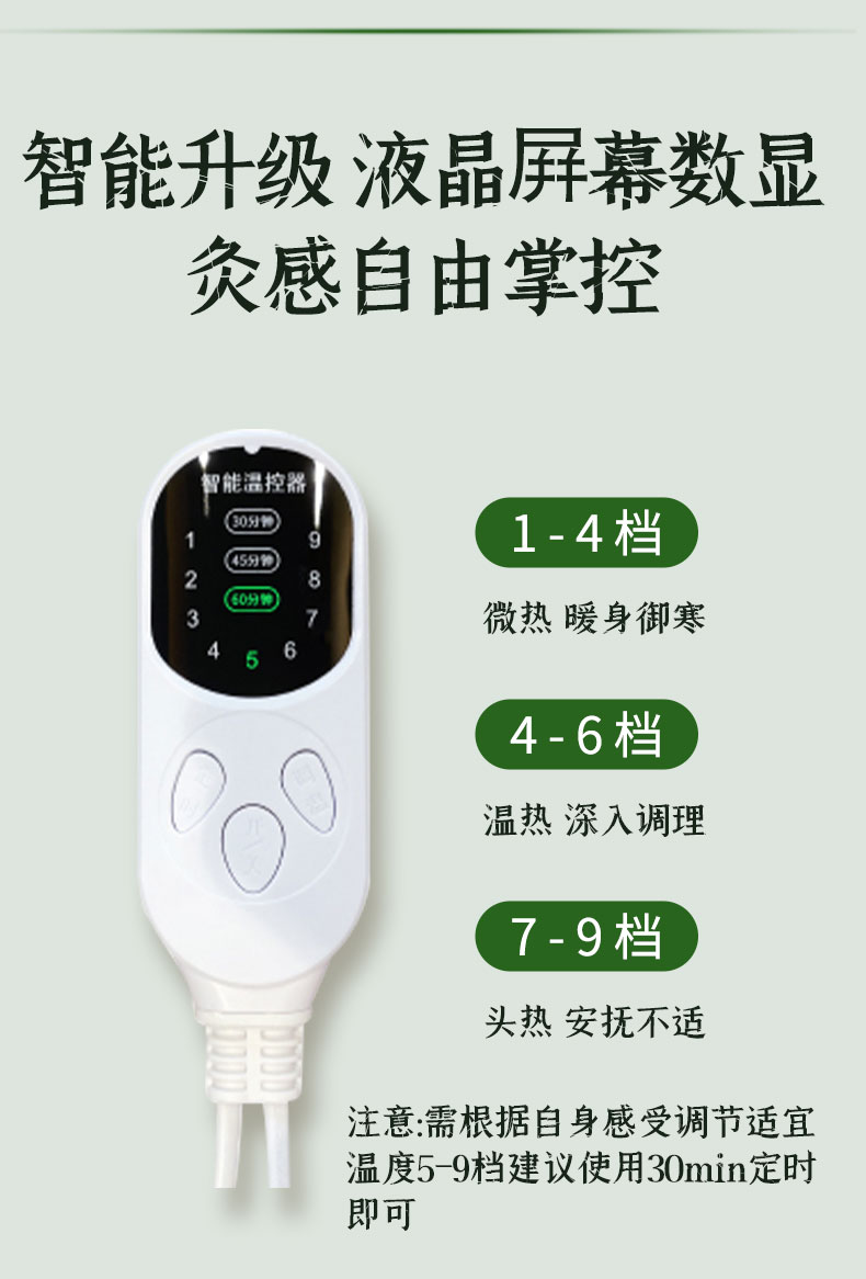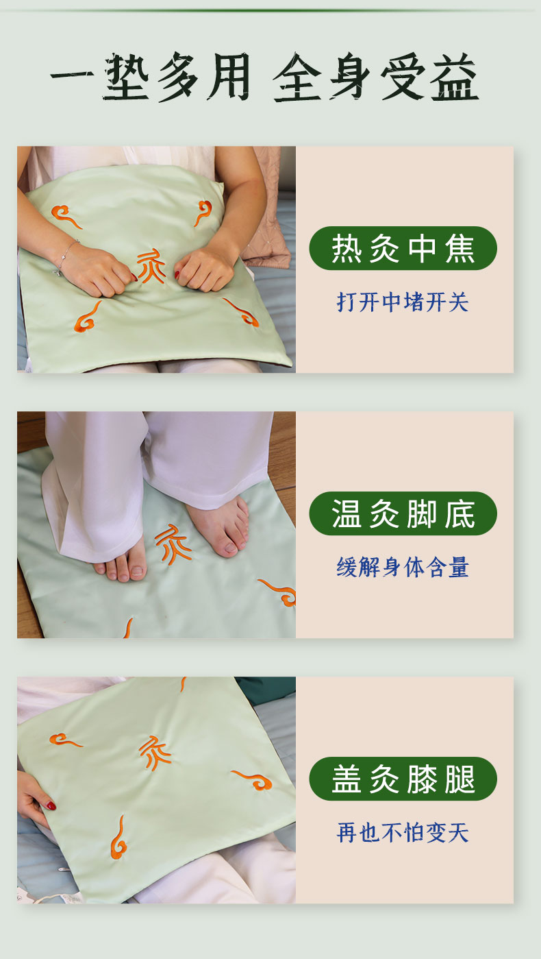 1、采用电加热片加热,智能温控自由调节热敷艾灸2、3档定时发热,9个温控档位,随心调节,(建议5-9档最舒适)3、热灸时间可选,适配不用热灸需求,(建议30分钟一次)2、一垫多用,全身受益,,温灸腰腹,灸足膝,热灸腿部等3、5秒即热,轻松坐灸,驱散寒冷缓解不适4、40*40CM大面积草本热灸5、分离式设计,内胆可取出,外套可清洗6、多档调温,定时断电,安全