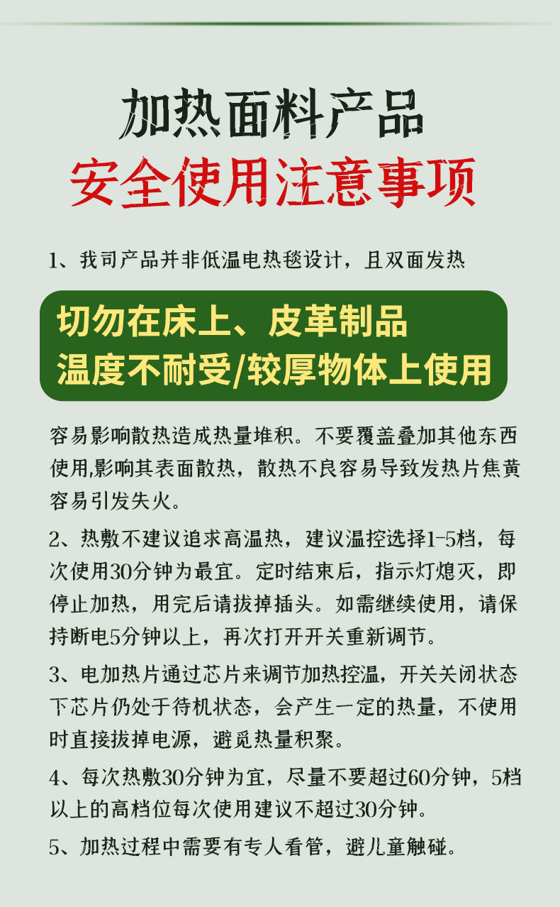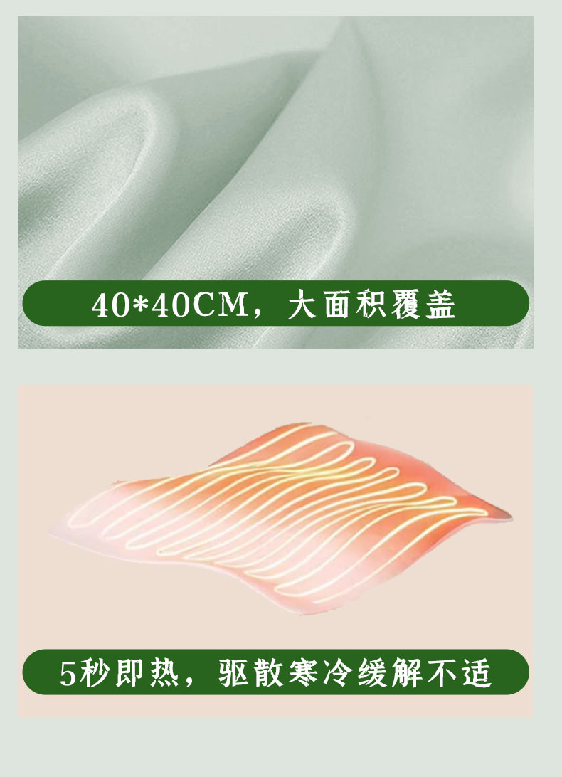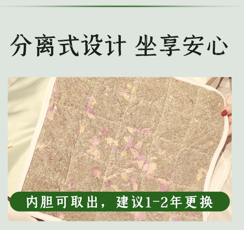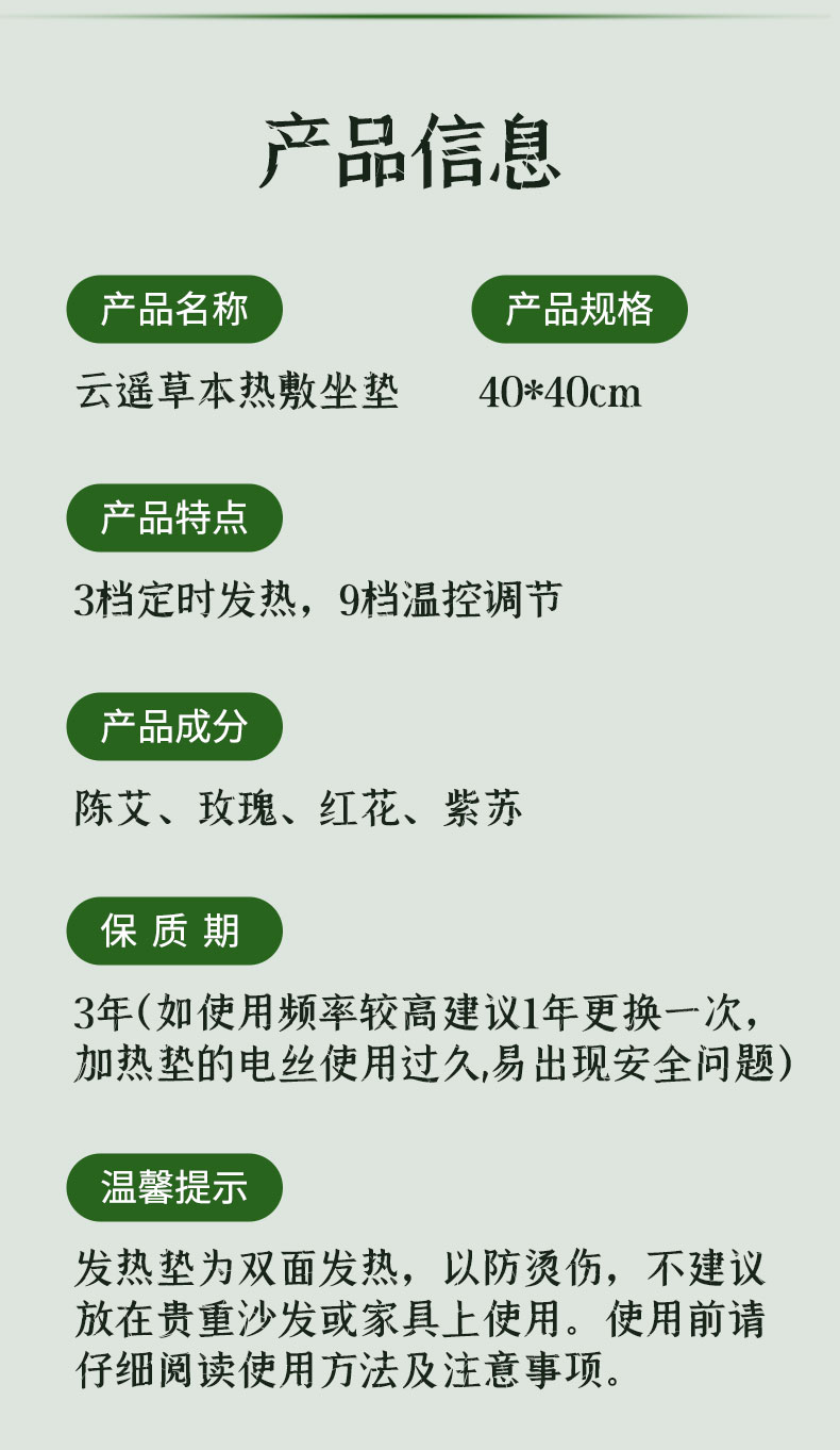 1、采用电加热片加热,智能温控自由调节热敷艾灸2、3档定时发热,9个温控档位,随心调节,(建议5-9档最舒适)3、热灸时间可选,适配不用热灸需求,(建议30分钟一次)2、一垫多用,全身受益,,温灸腰腹,灸足膝,热灸腿部等3、5秒即热,轻松坐灸,驱散寒冷缓解不适4、40*40CM大面积草本热灸5、分离式设计,内胆可取出,外套可清洗6、多档调温,定时断电,安全