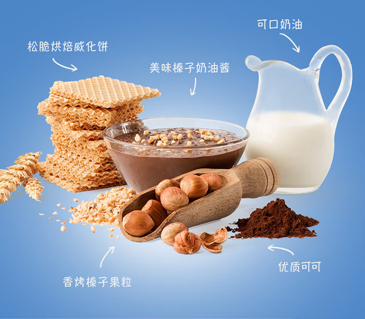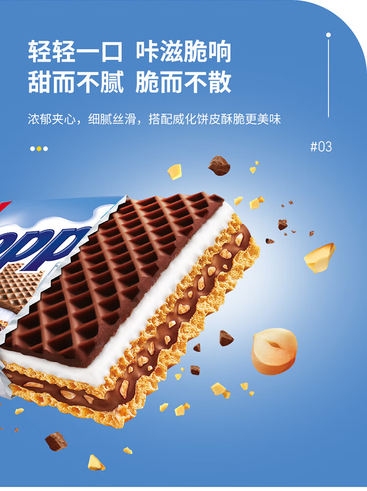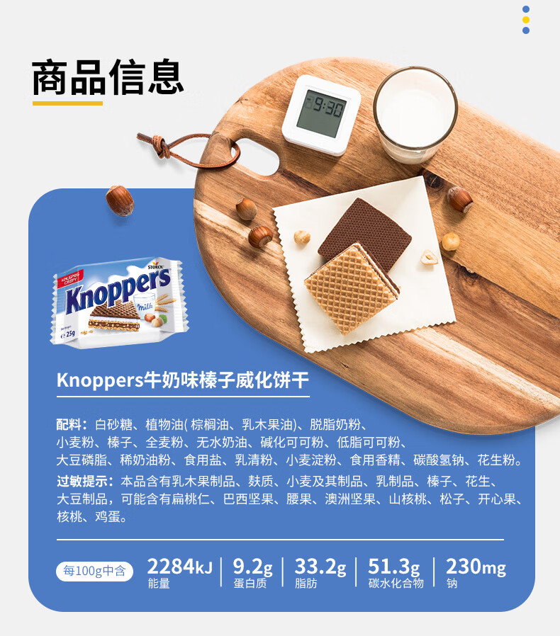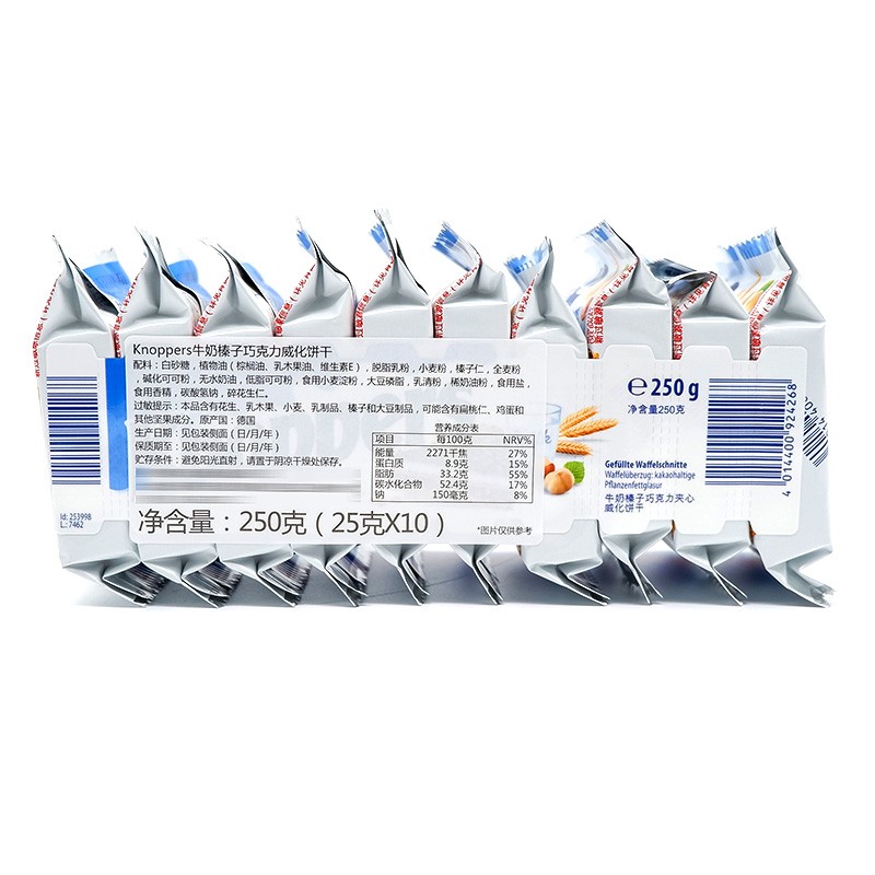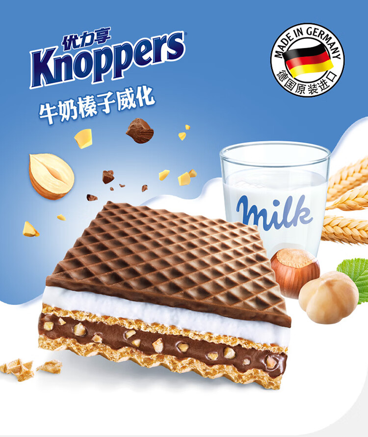 knoppers德国进口 优力享牛奶榛子巧克力威化饼干250g 五层夹心休闲零食