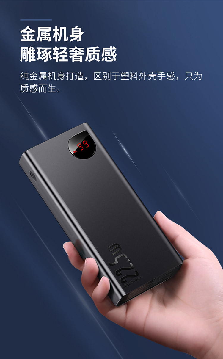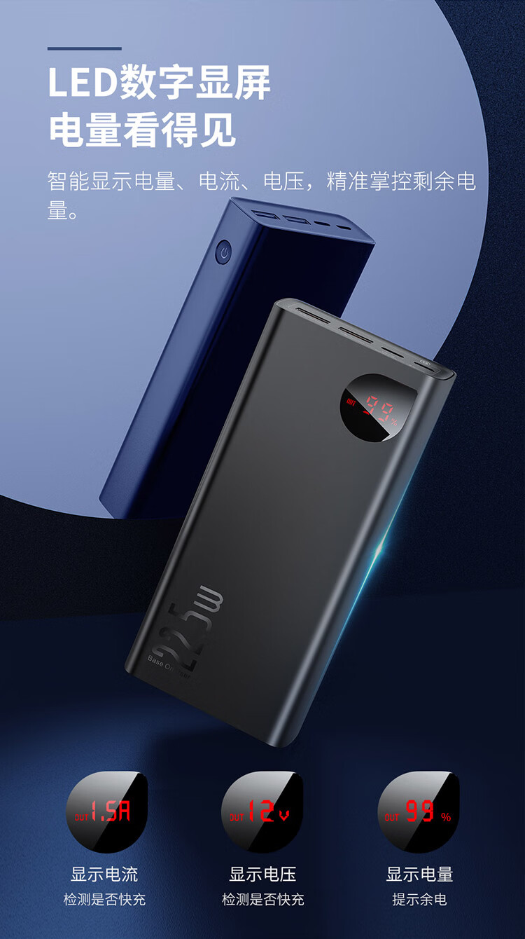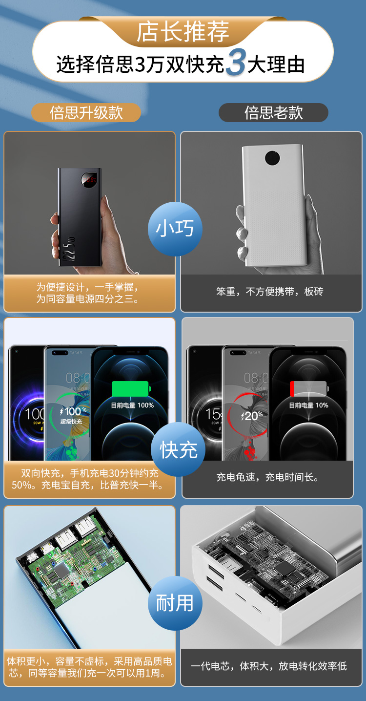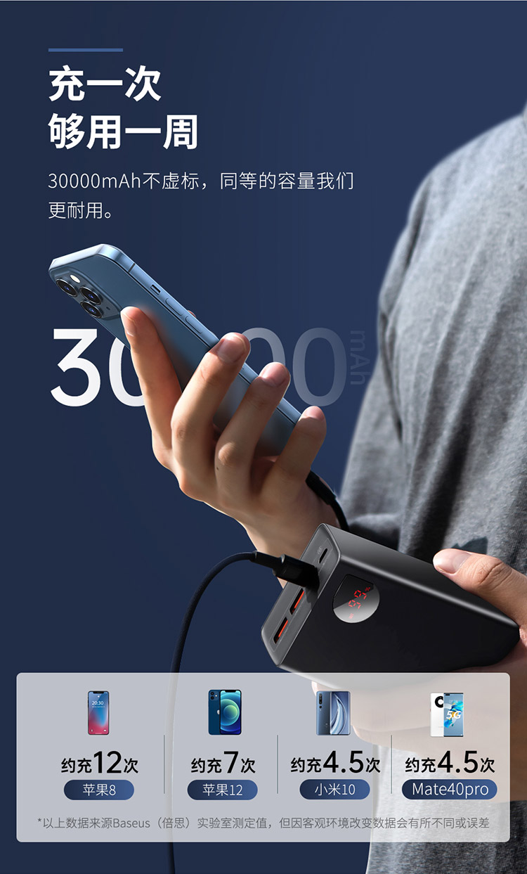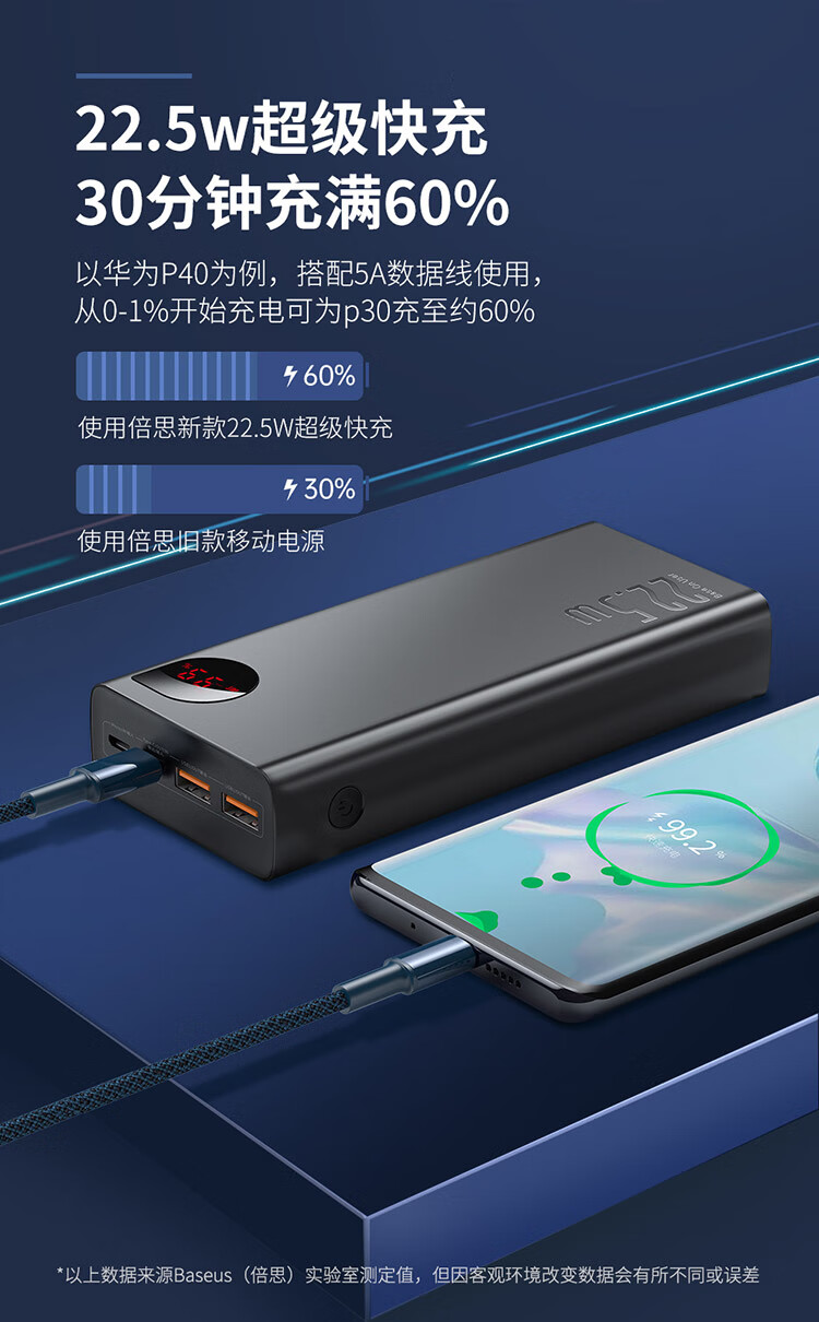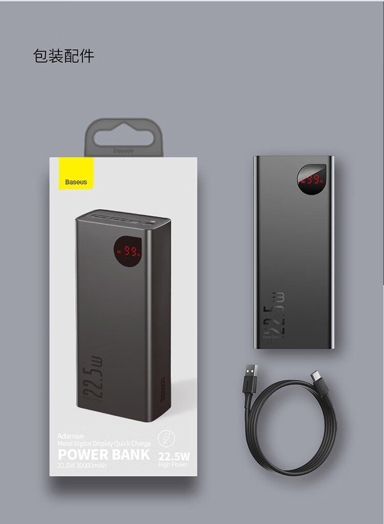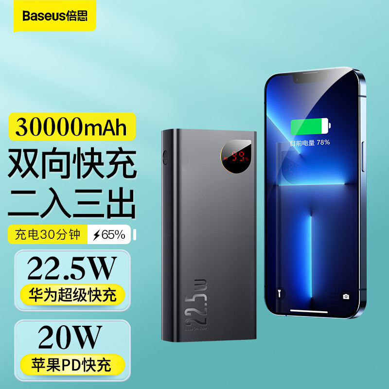 倍思 充电宝30000毫安时 支持华为22.5W超级快充苹果PD20W 大容量快充移动电源 适用苹果小米华为安卓手机
