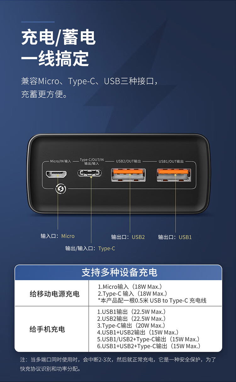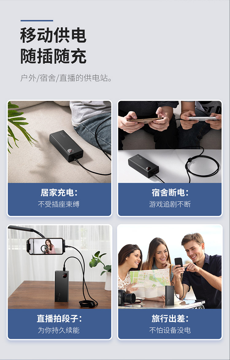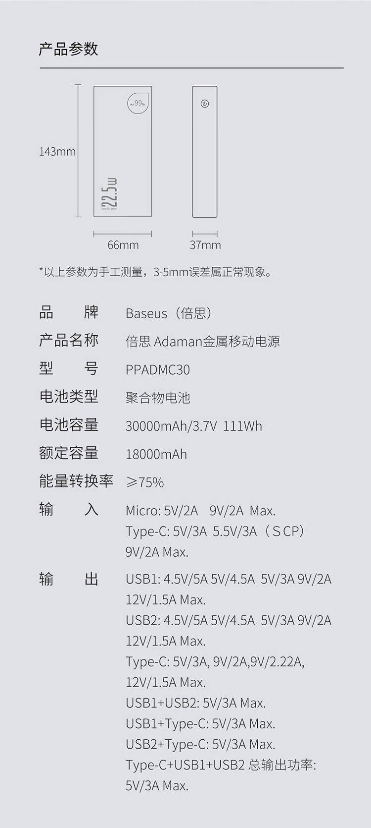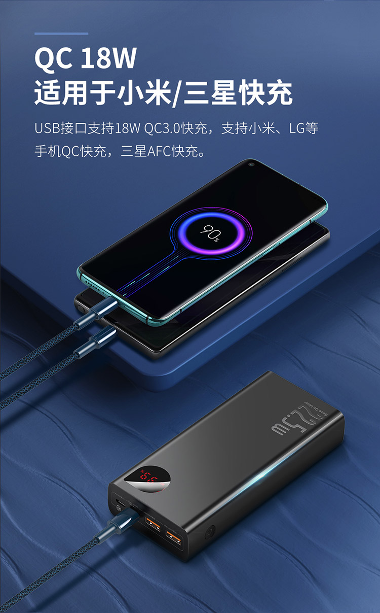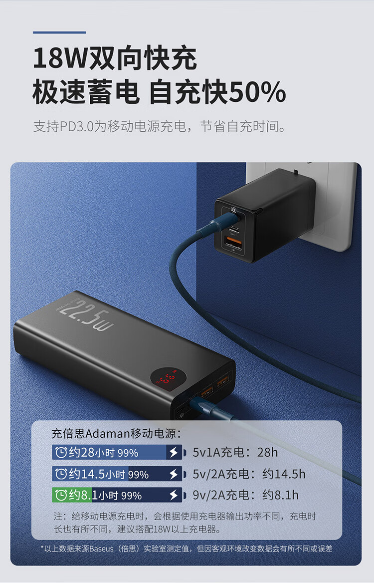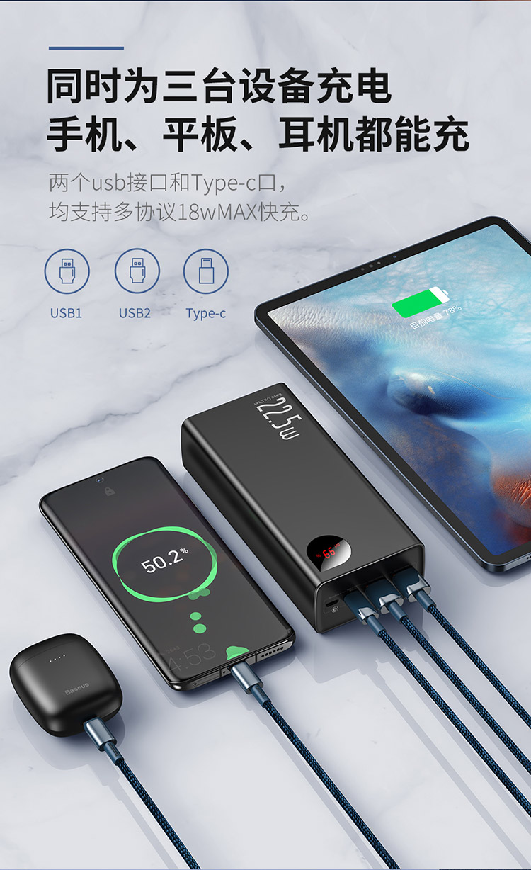 倍思 充电宝30000毫安时 支持华为22.5W超级快充苹果PD20W 大容量快充移动电源 适用苹果小米华为安卓手机