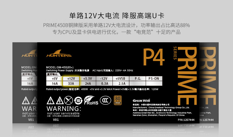 长城(GreatWall)额定450W PRIME450铜牌版游戏电源(80PLUS铜牌/12V大电流/DC-DC/智能温控/日系固态电容)