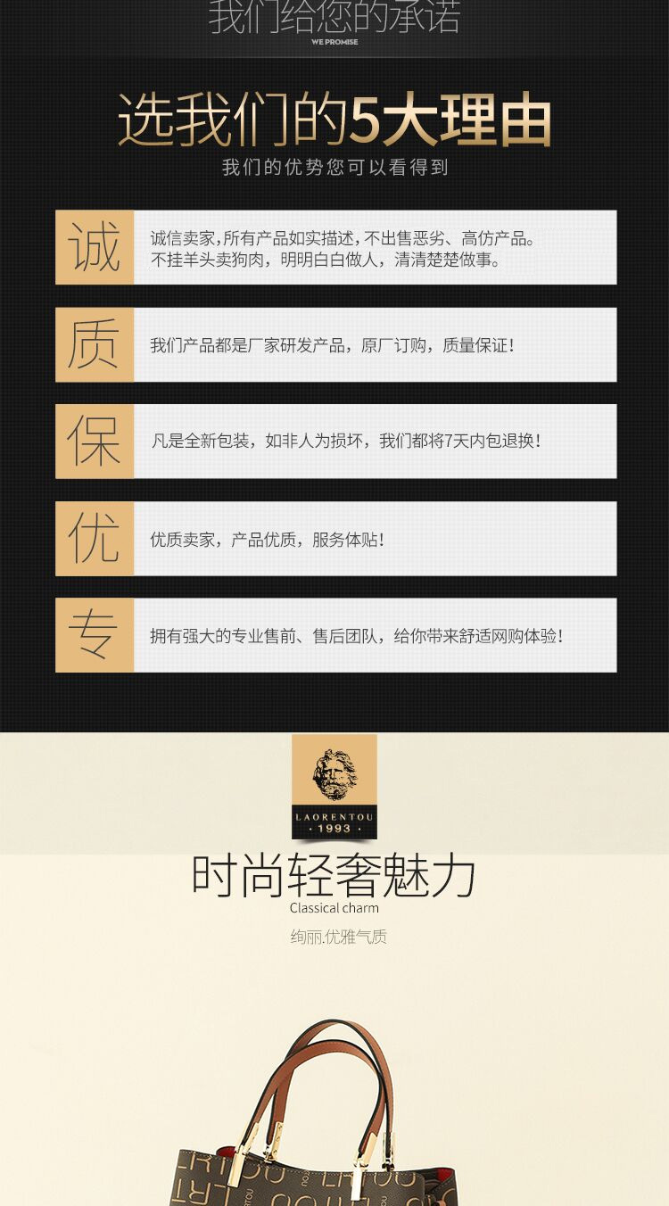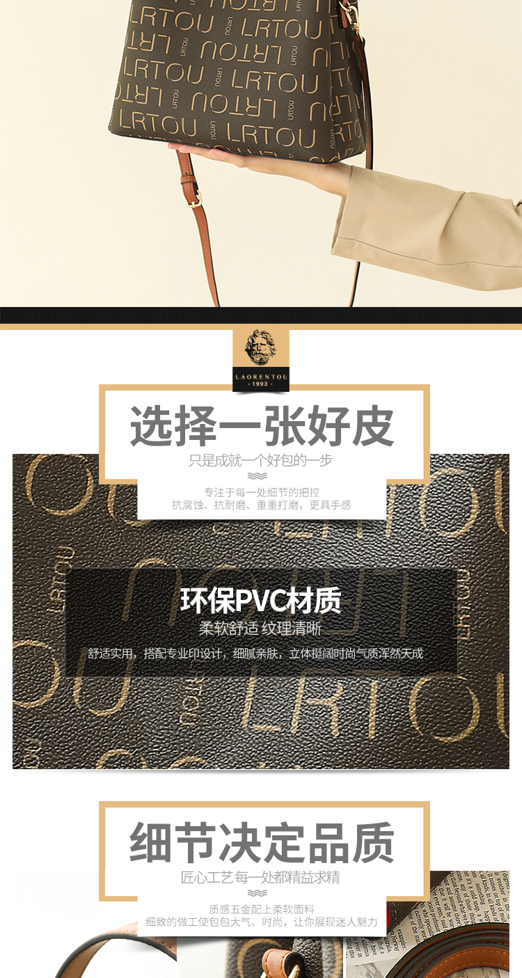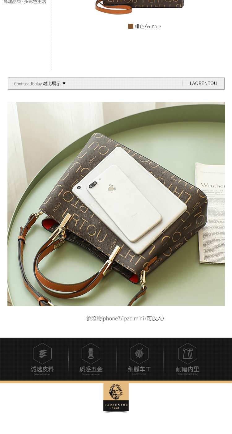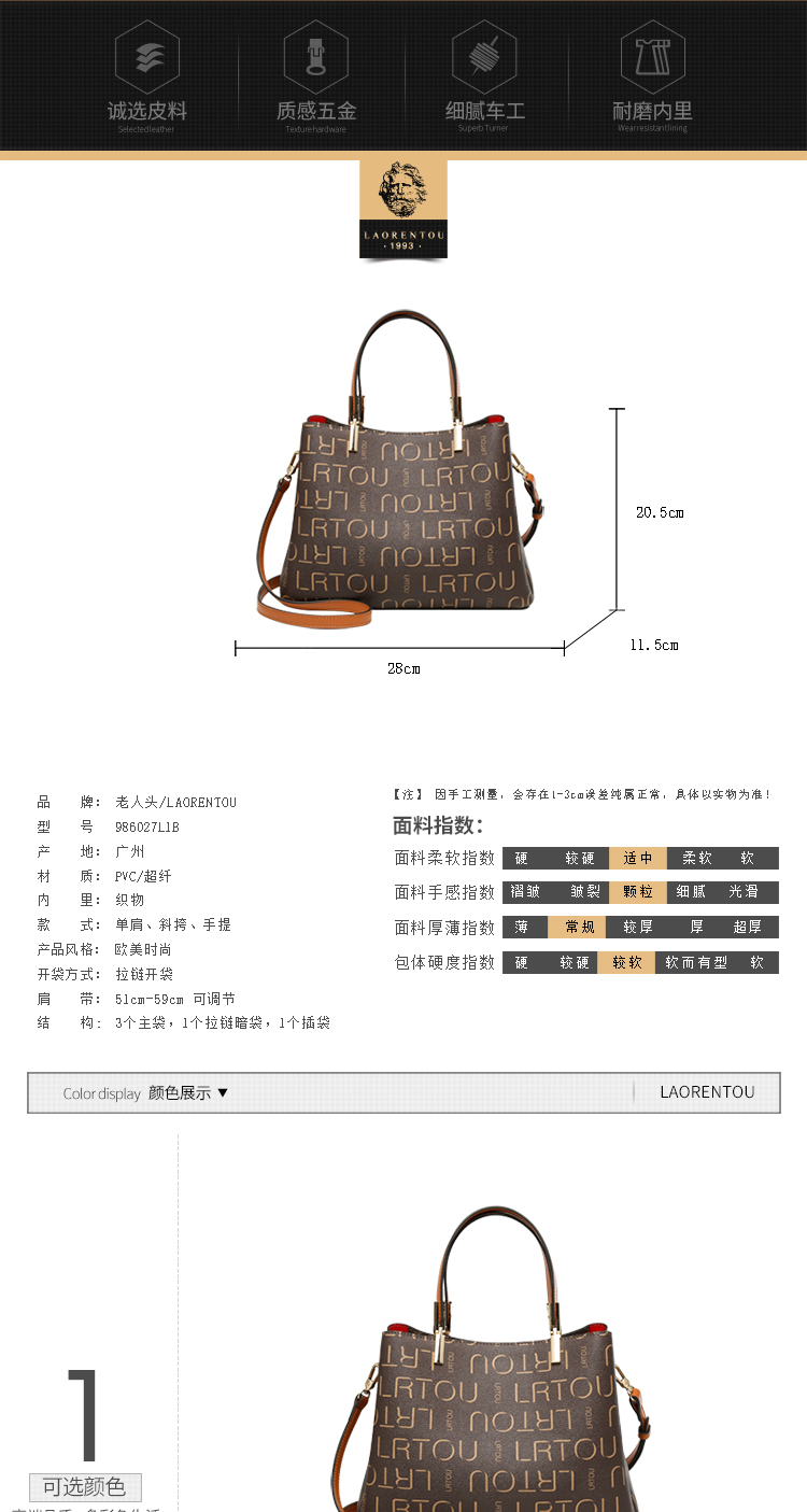 品 牌 :老人头(LAORENTOU) 名 称 : 单肩包 材质:PVC/超纤 里料:织物 颜色:啡色 净重量:0.68KG 内设:3个杂物袋,1个拉链暗袋,1个插袋