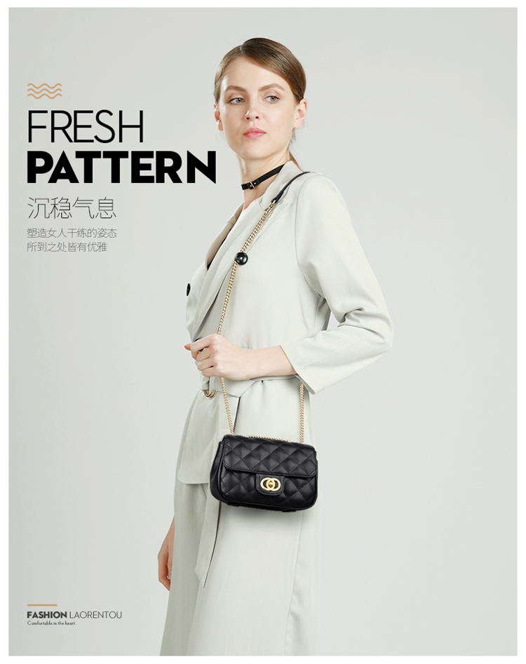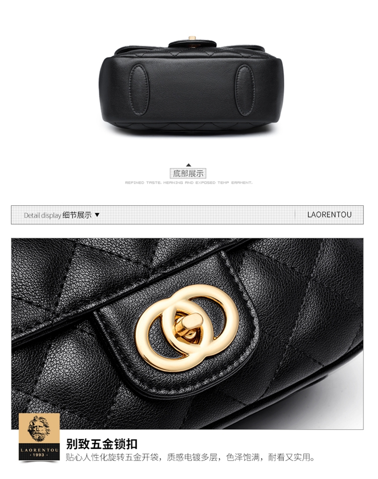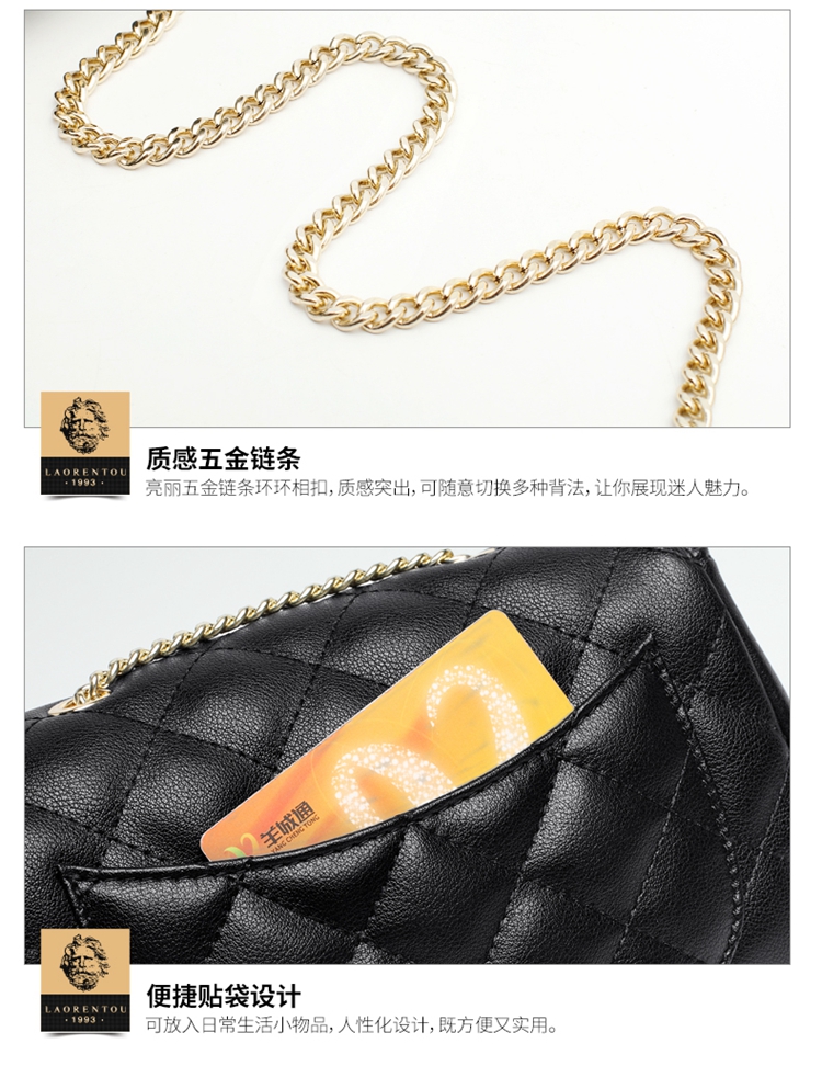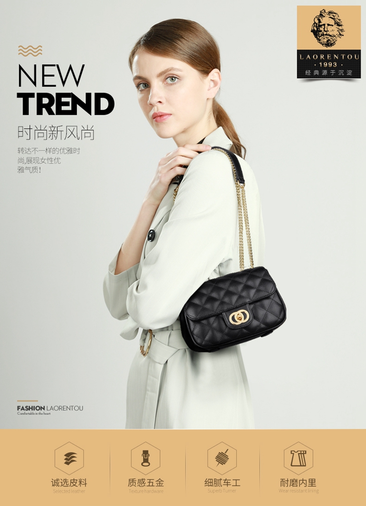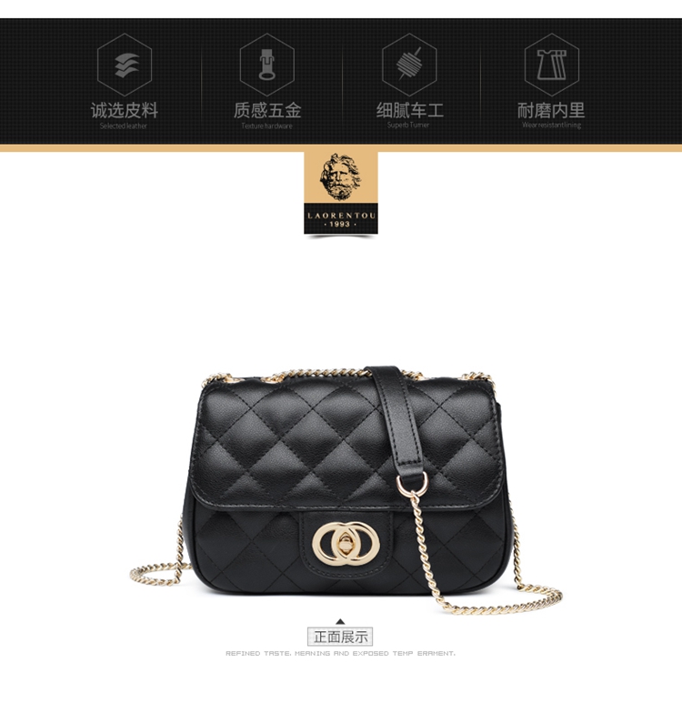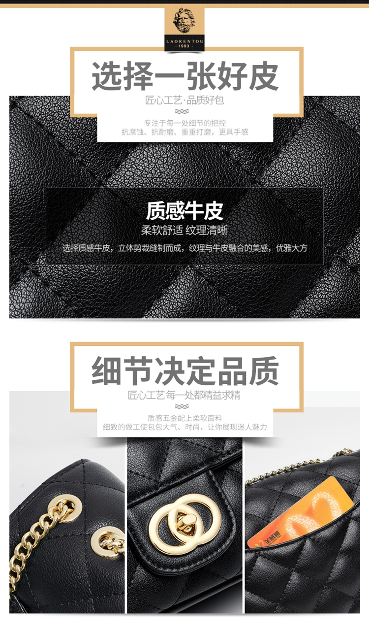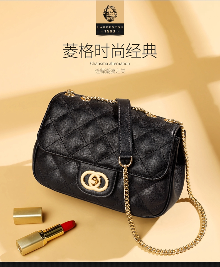 老人头(LAORENTOU)包包女包牛皮单肩斜挎包女菱格气质韩版百搭链条包小方包女黑色